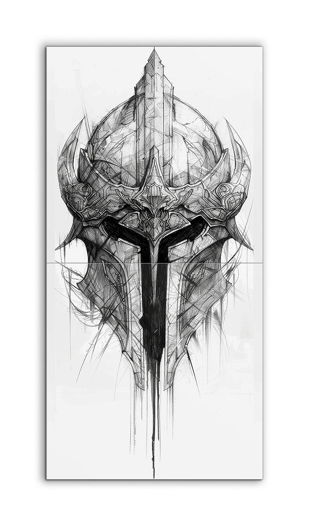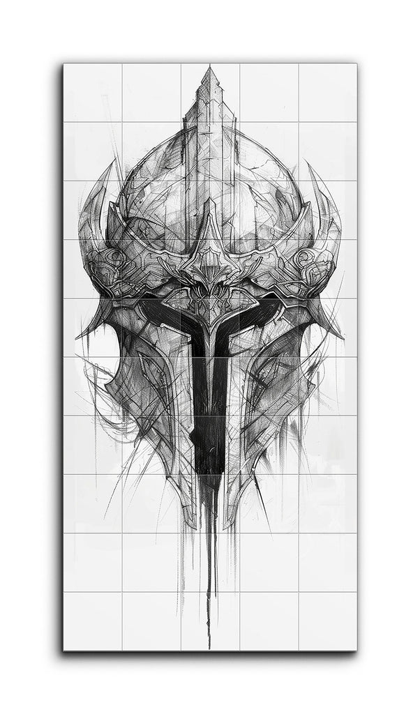 This tile mural showcases an intricately designed helmet, blending medieval and fantasy elements in a detailed, abstract style. The helmet, with its prominent central ridge and ornate decorations, features a symmetrical composition adorned with complex patterns and textures. The sketch-like lines, varying in thickness, add depth and dimension, while the lower part tapers into fine, almost dripping lines, introducing fluidity and movement. Shading and cross-hatching techniques enhance its three-dimensional, dynamic feel.