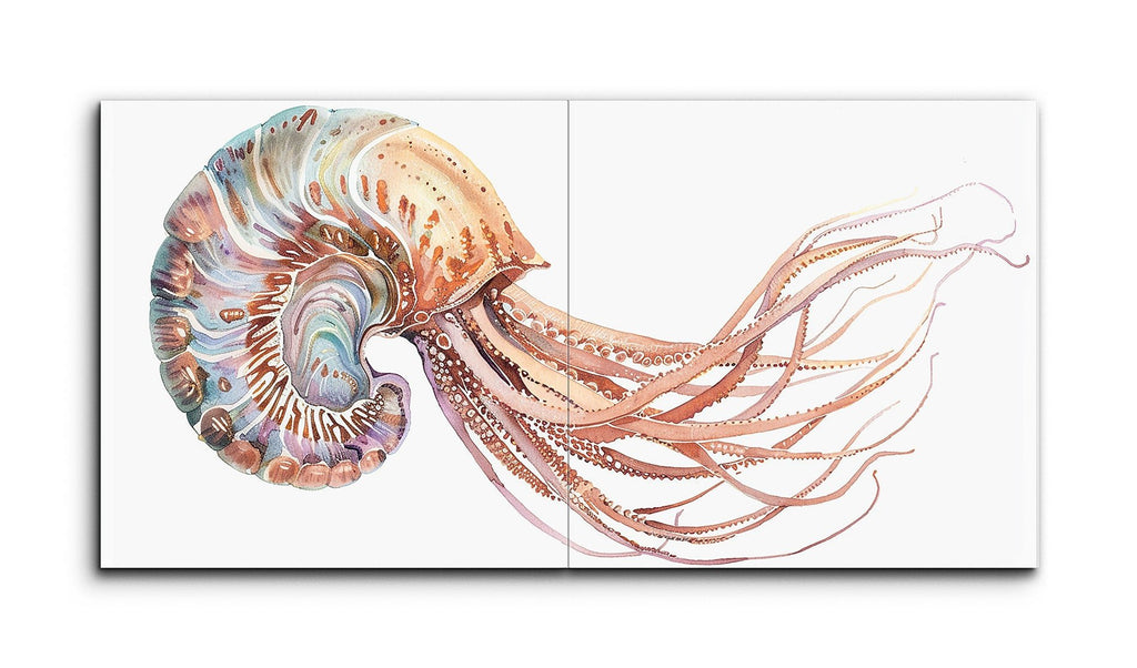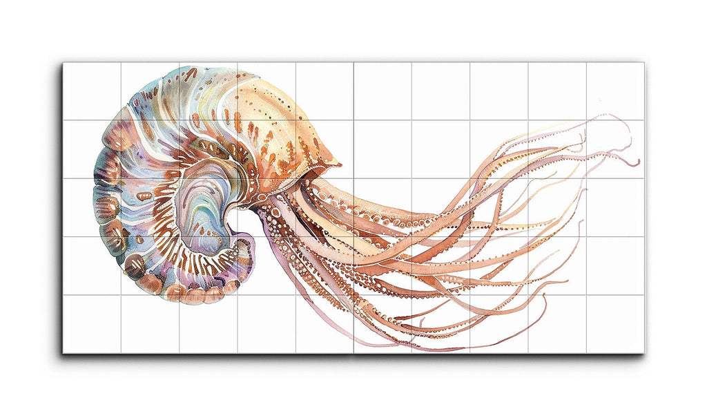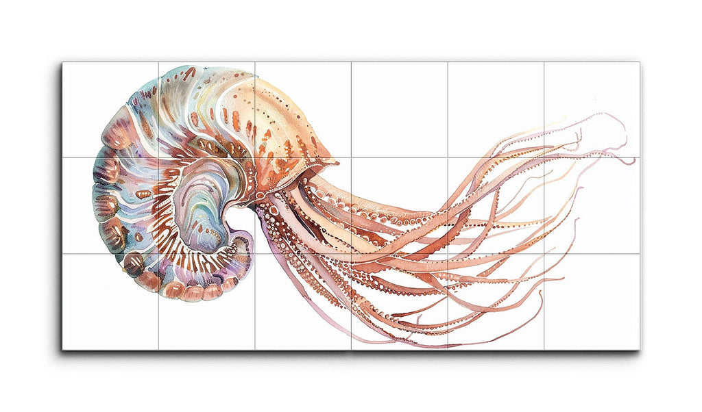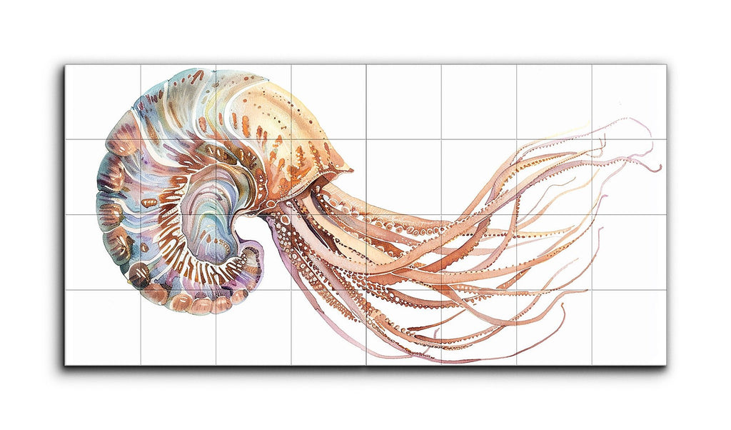 This tile mural features a stylized depiction of a nautilus or similar cephalopod, split across two panels in a diptych format. The left panel showcases the creature's intricately patterned shell with swirling lines and shapes, while the right panel extends its numerous, finely detailed tentacles. Rendered in a warm palette of soft oranges, browns, and subtle blues, the artwork blends realism with decorative elements, capturing the ornate beauty and fluidity of marine life in a fantastical, artistic style.