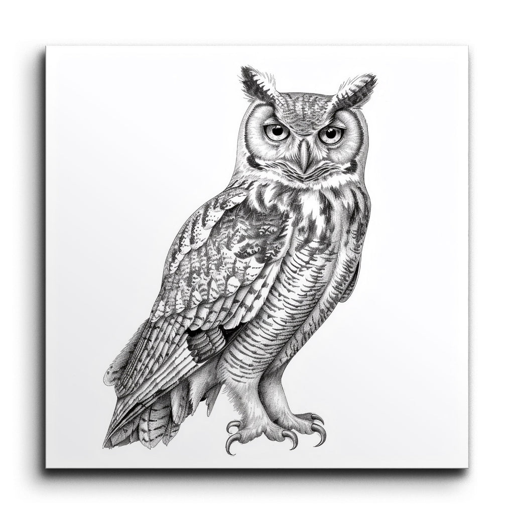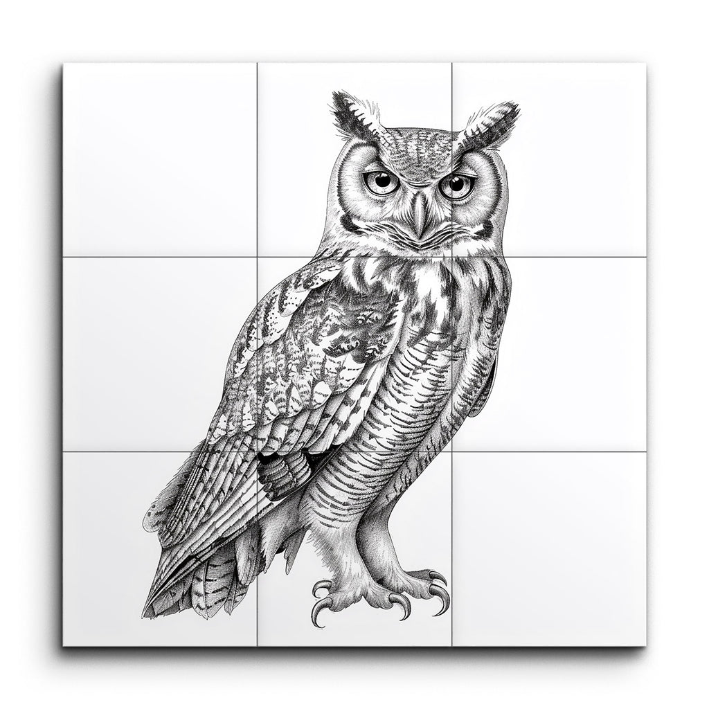 Transform your space with this stunning tile mural featuring a lifelike illustration of an owl. The artwork captivates with its intricate line work and masterful shading, showcasing the owl's meticulously rendered feathers and striking, intense eyes. The monochromatic palette of black and grey enhances the depth and realism, while the detailed talons and sharp beak add to the owl's commanding presence. Perfectly balanced, this piece draws you into the owl's world, making a bold and elegant statement.