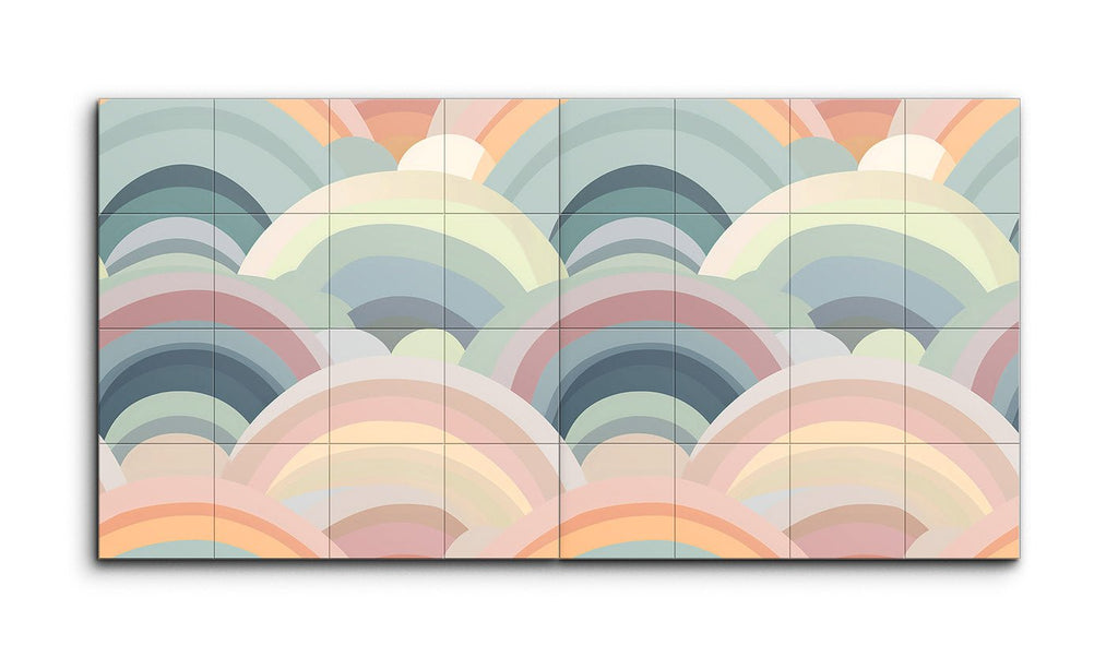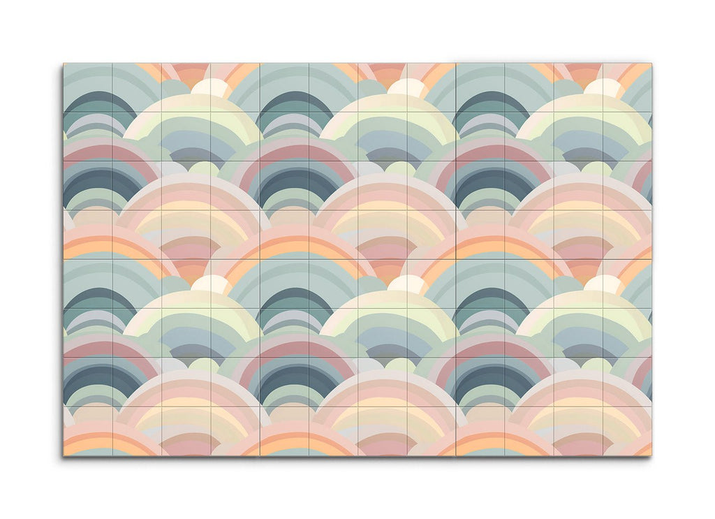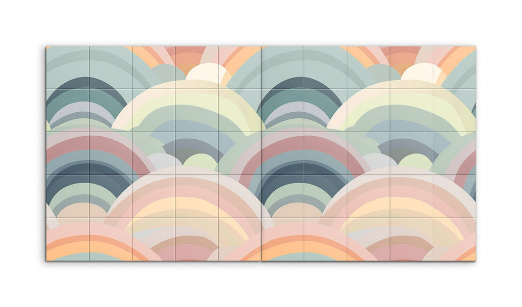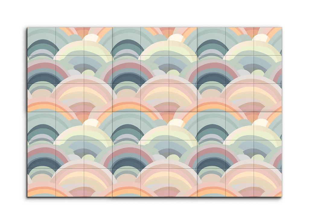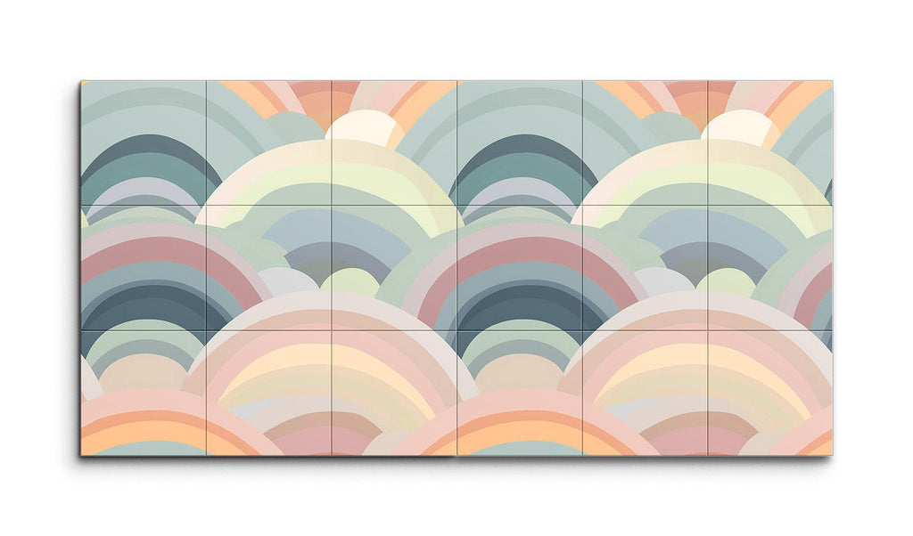 Transform your space with this captivating tile mural, featuring an abstract composition of overlapping, semi-circular arcs that evoke layered hills or rainbows. Rendered in a soothing pastel palette of blues, greens, pinks, yellows, and oranges, each arc showcases a gradient effect that enhances the artwork's dynamic yet harmonious feel. The smooth, flowing lines and balanced rhythm of the design create a serene and calming atmosphere, perfect for any room seeking a touch of elegance and tranquility.