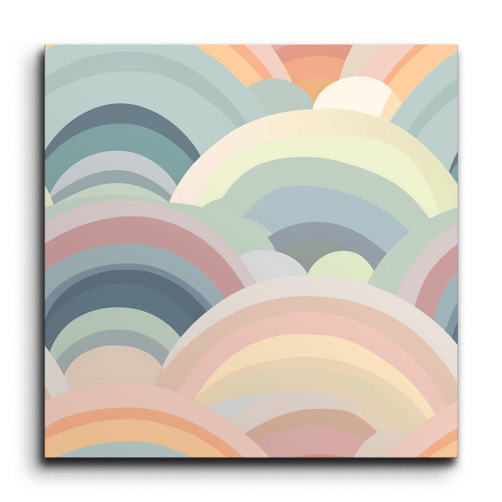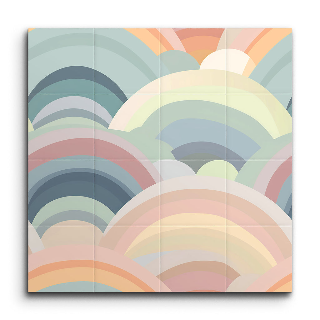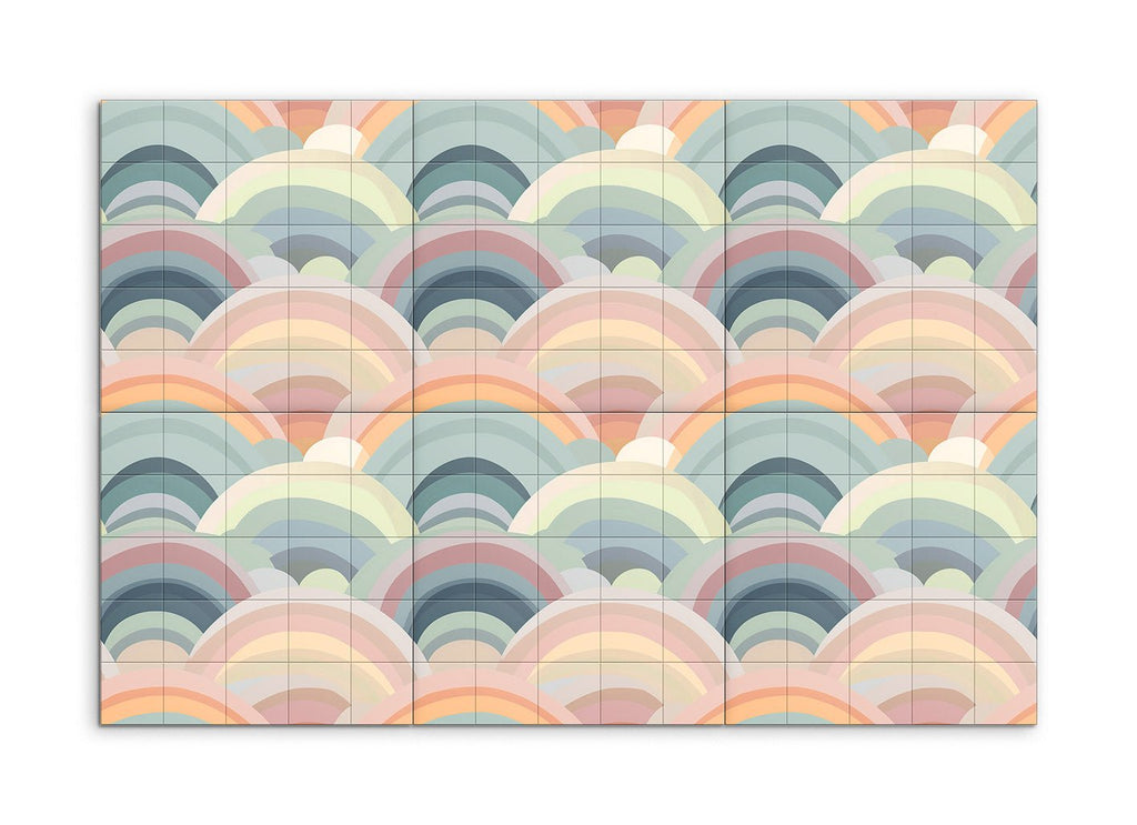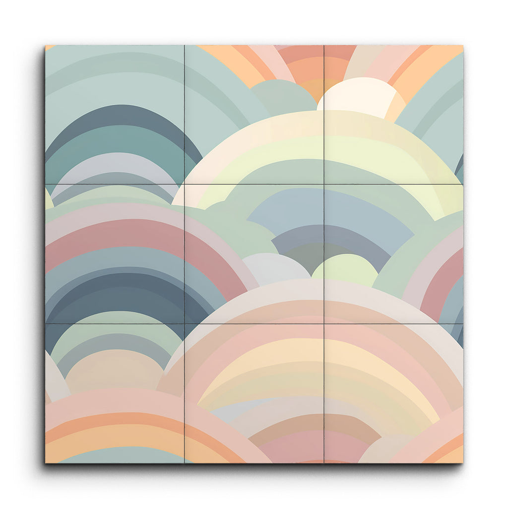 Transform your space with this captivating tile mural, featuring an abstract composition of overlapping, semi-circular arcs that evoke layered hills or rainbows. Rendered in a soothing pastel palette of blues, greens, pinks, yellows, and oranges, each arc showcases a gradient effect that enhances the artwork's dynamic yet harmonious feel. The smooth, flowing lines and balanced rhythm of the design create a serene and calming atmosphere, perfect for any room seeking a touch of elegance and tranquility.