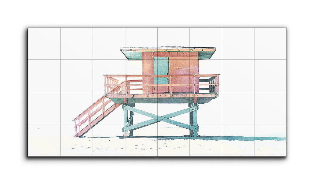 This tile mural features a stylized lifeguard tower, divided into two panels that together form a harmonious image. The structure is depicted with straight and angular lines, capturing its sturdy framework and essential elements like the cabin, deck, and staircase. Rendered in muted pastel tones of pink, turquoise, and soft greens, the artwork evokes a serene beach atmosphere. With a modern, graphic quality reminiscent of screen printing, it balances form and color to convey a nostalgic yet contemporary coastal vibe.