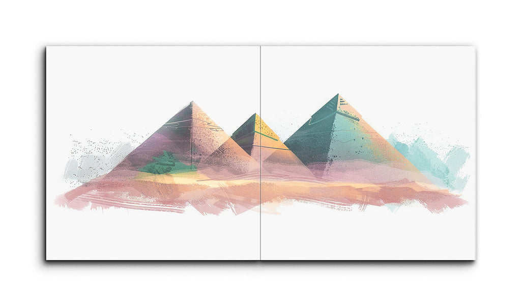 The artwork is a modern, abstract depiction of a landscape, possibly mountains, split into two canvases forming a diptych. It features geometric, triangular shapes representing mountain peaks. The color palette is soft and pastel, with shades of pink, green, blue, and yellow blending seamlessly. The loose, expressive brushwork adds texture and movement, creating an ethereal atmosphere. The division into two panels and the use of negative space invite viewers to engage and imagine the connection.