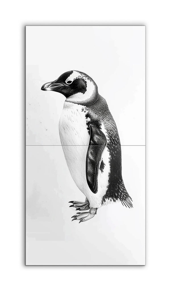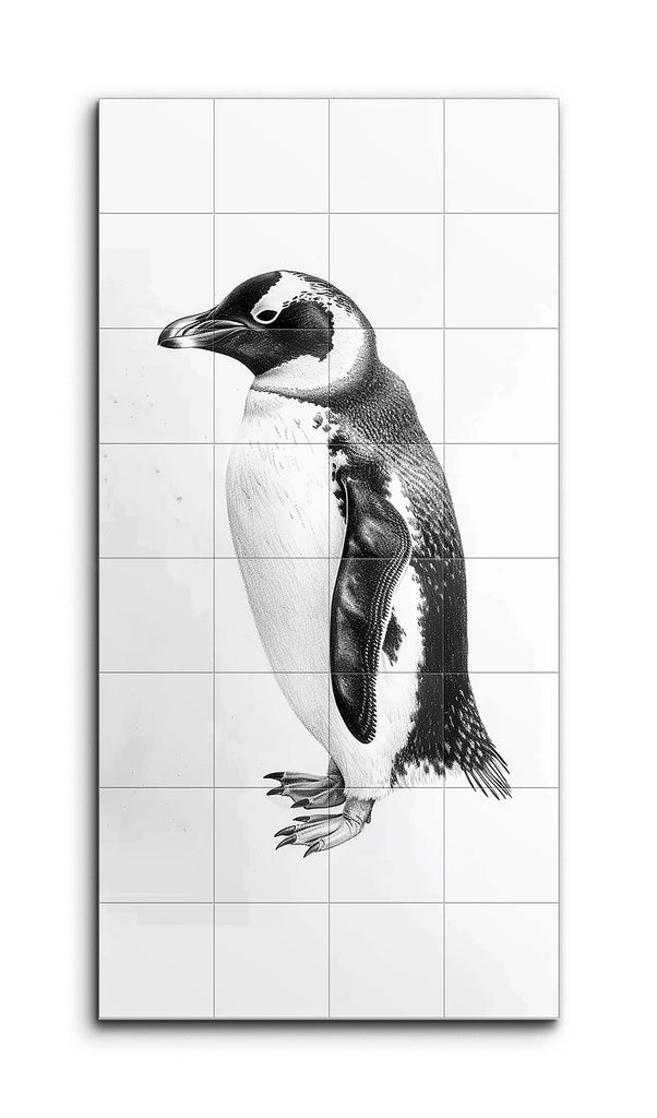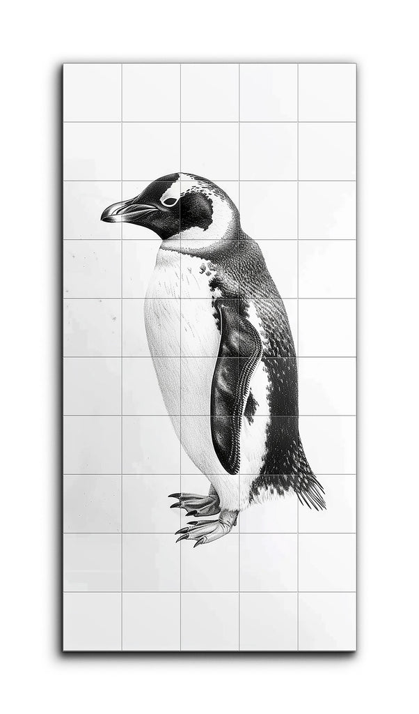 This tile mural features a meticulously detailed, black-and-white illustration of a penguin in side profile, facing left. The artist's attention to detail is evident in the realistic texture of the feathers, rendered with fine lines that convey their softness and density. The head and beak are intricately shaded to add depth, while the flipper and feet showcase precise line work that highlights the texture of the skin and claws. The overall style leans towards realism, emphasizing lifelike representation through detailed line work and shading.