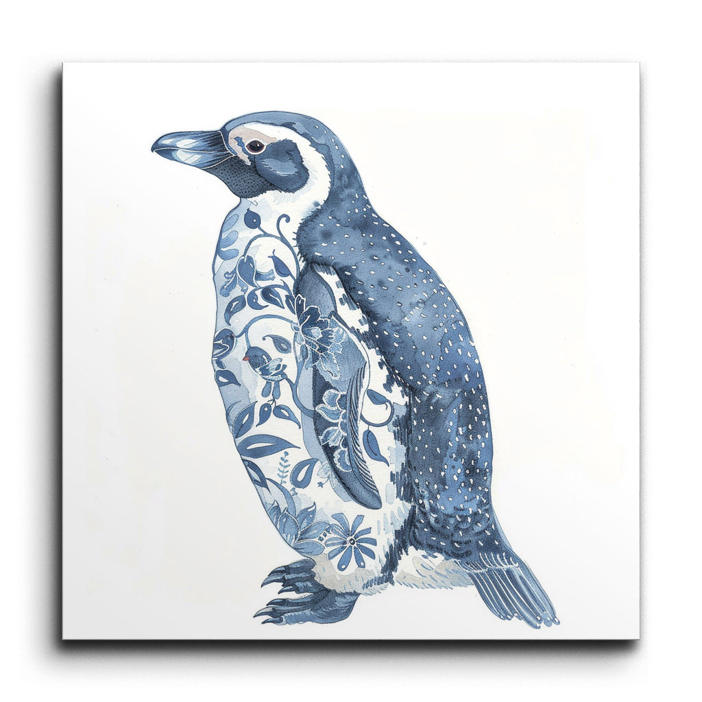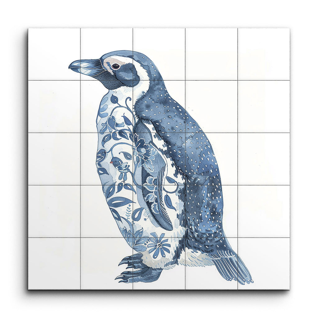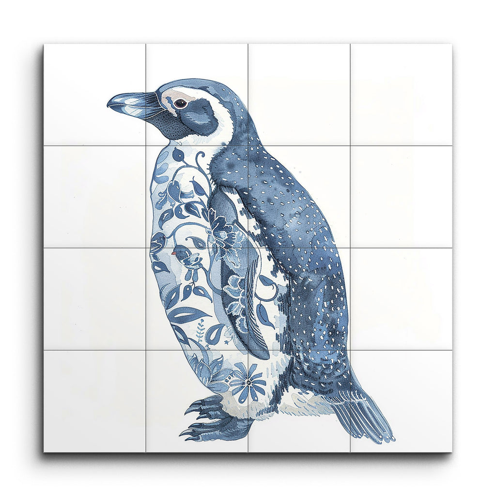 Transform your space with this captivating tile mural featuring a stylized side profile of a penguin. The artwork masterfully blends realism and whimsy, showcasing the penguin in serene shades of blue and white. The right side of the penguin is detailed with fine lines and dots, while the left side is adorned with intricate floral patterns in varying shades of blue. This unique combination of natural and decorative elements creates a visually appealing piece that will add a touch of artistry and charm to any setting.