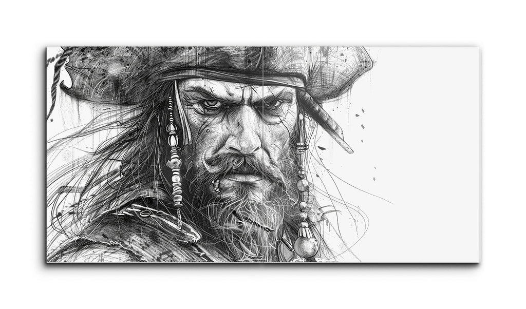 This tile mural showcases a detailed monochromatic portrait of a pirate, rendered with intricate line work and shading. The male figure's stern expression, piercing eyes, and furrowed brows create a dynamic and textured appearance. Adorned with a bandana, large hoop earrings, and beaded hair, the rugged character's weathered hat and finely detailed beard add to the realism. The meticulous depiction of wrinkles, scars, and skin texture conveys his adventurous life at sea, telling a compelling story through his intense gaze.