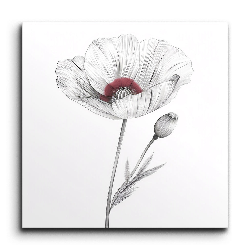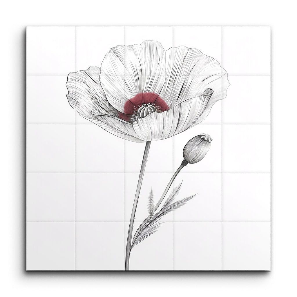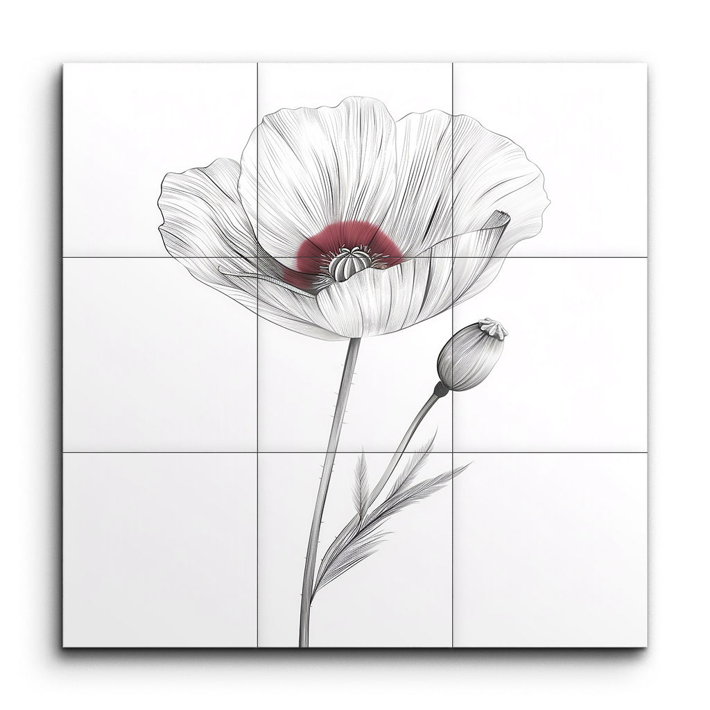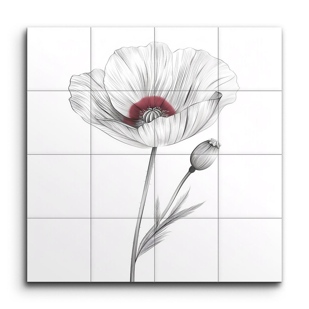 Transform your space with this exquisite tile mural featuring a delicate and detailed illustration of a poppy flower. The minimalistic and refined style showcases fine, precise lines that emphasize the flower's intricate structure and texture. Subtle, flowing lines capture the gentle curves and natural folds of the petals, with a soft, muted red hue highlighting the flower's center. The elegant composition, with its graceful stem and bud, brings a timeless and classic beauty to any setting.