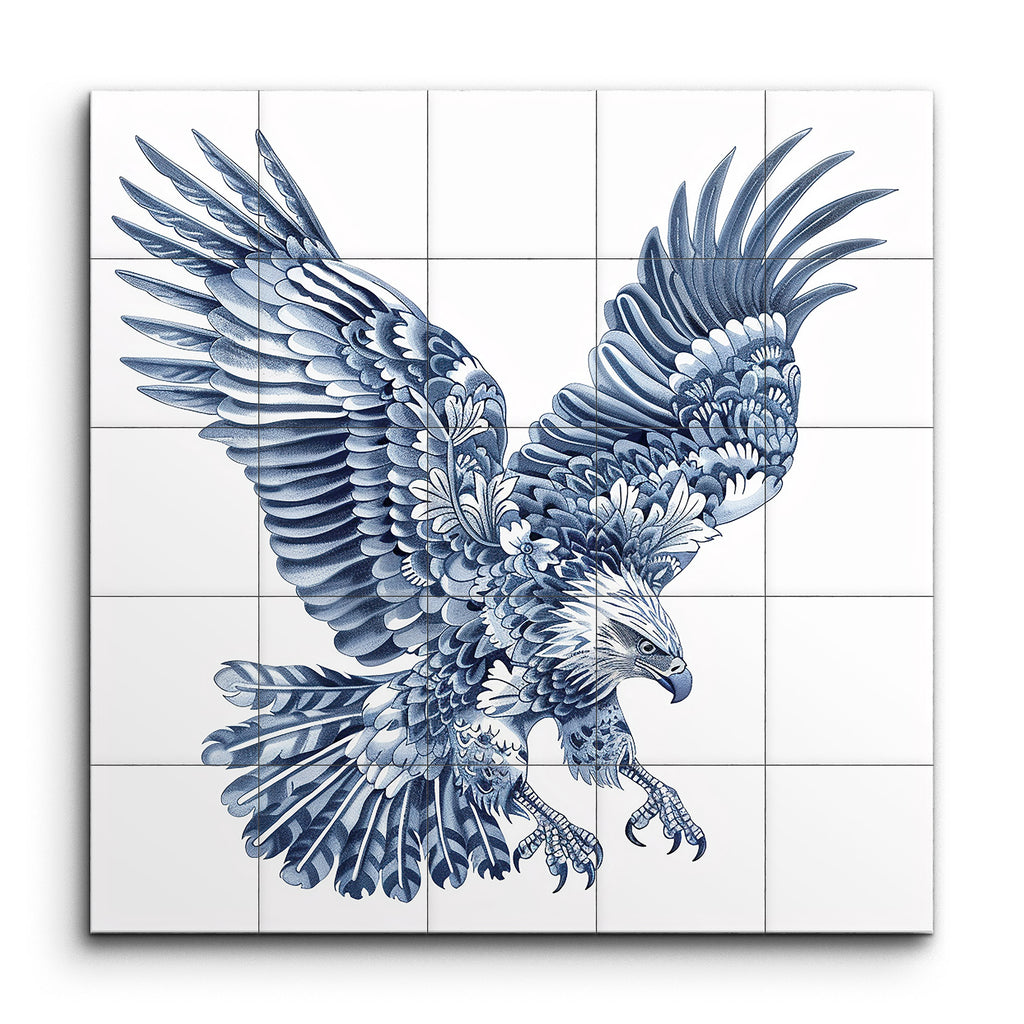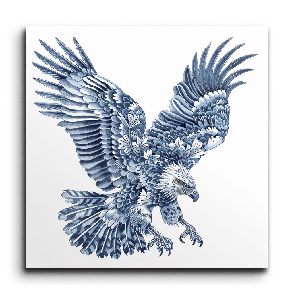 Transform your space with this captivating tile mural featuring a highly detailed, stylized eagle in mid-flight. Rendered in a monochromatic blue palette, the eagle exudes a porcelain-like elegance. Intricately drawn feathers create a dynamic sense of texture and movement, while the wide-spread wings and extended talons capture a moment of intense action. This artwork masterfully blends realism with ornamental detailing, resulting in a striking and sophisticated visual masterpiece.