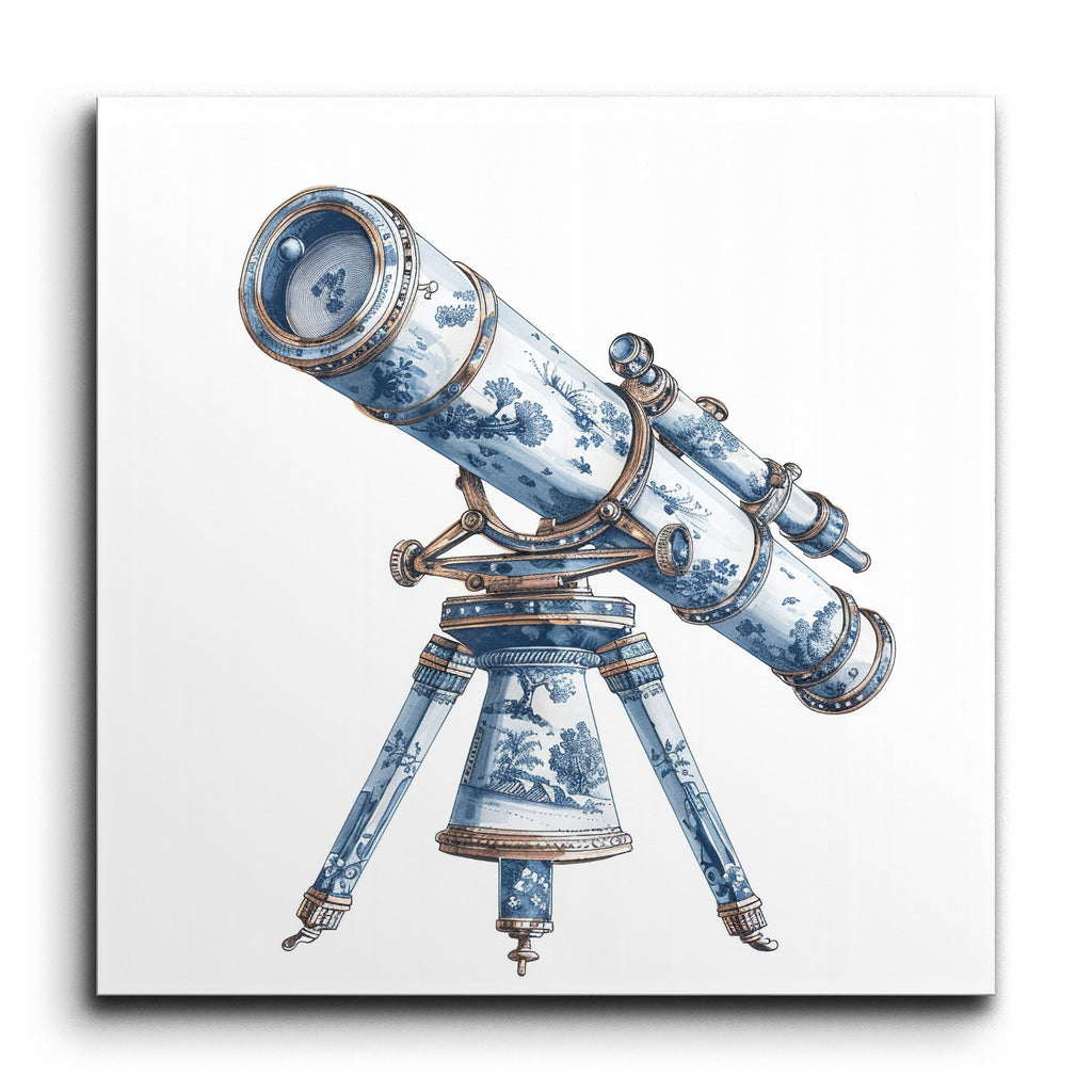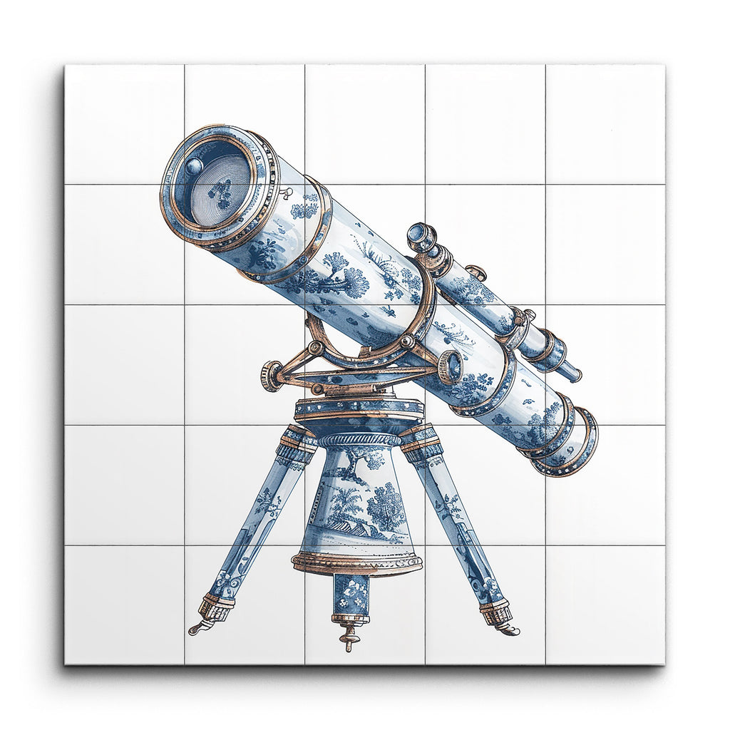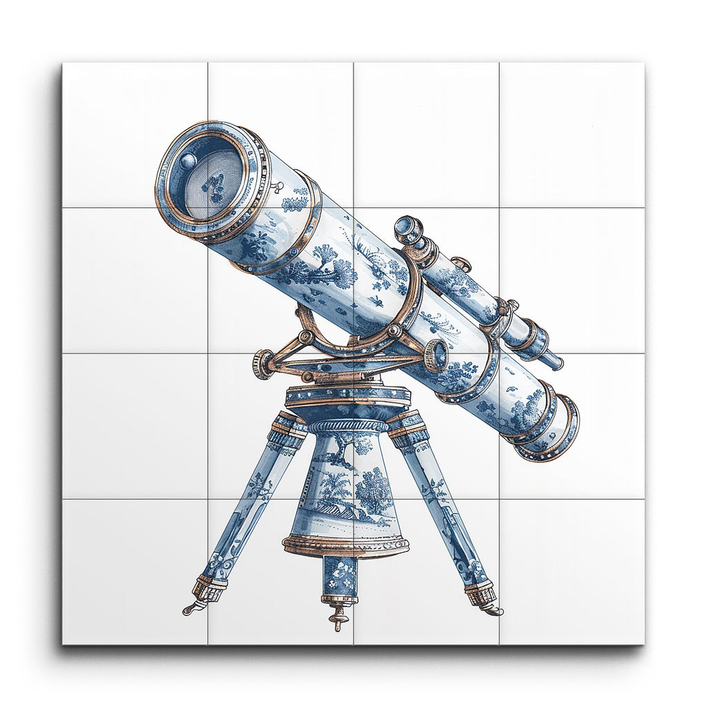 Transform your space with our exquisite tile mural featuring a stunning illustration of a telescope, inspired by traditional blue and white porcelain art. This intricate design showcases the telescope adorned with delicate blue patterns on a pristine white base, depicting serene nature scenes reminiscent of classic Chinese vases or plates. Mounted on an equally ornate tripod stand, this piece harmoniously blends scientific precision with artistic elegance, creating a timeless and visually captivating masterpiece.
