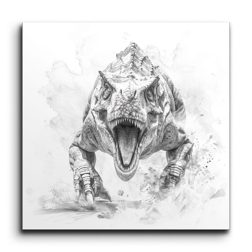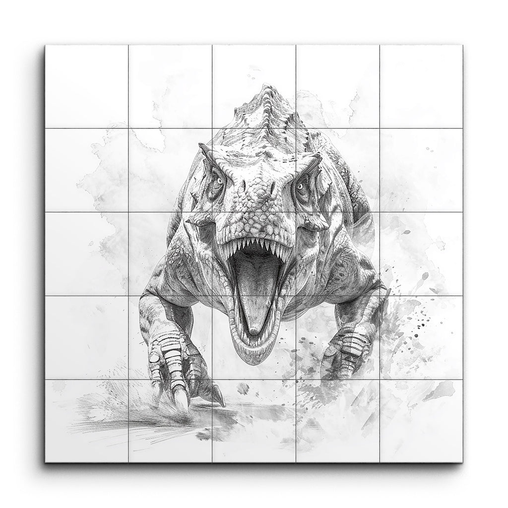 Unleash the primal power of the past with this captivating tile mural featuring a meticulously detailed pencil drawing of a fierce Tyrannosaurus rex. The dynamic, front-facing T. rex, with its mouth wide open and sharp teeth on full display, exudes aggression and strength. The artist's masterful rendering of the scaly skin, powerful musculature, and menacing claws creates a lifelike presence, while the subtle, abstract background splashes add movement and energy, making the T. rex leap off the surface.