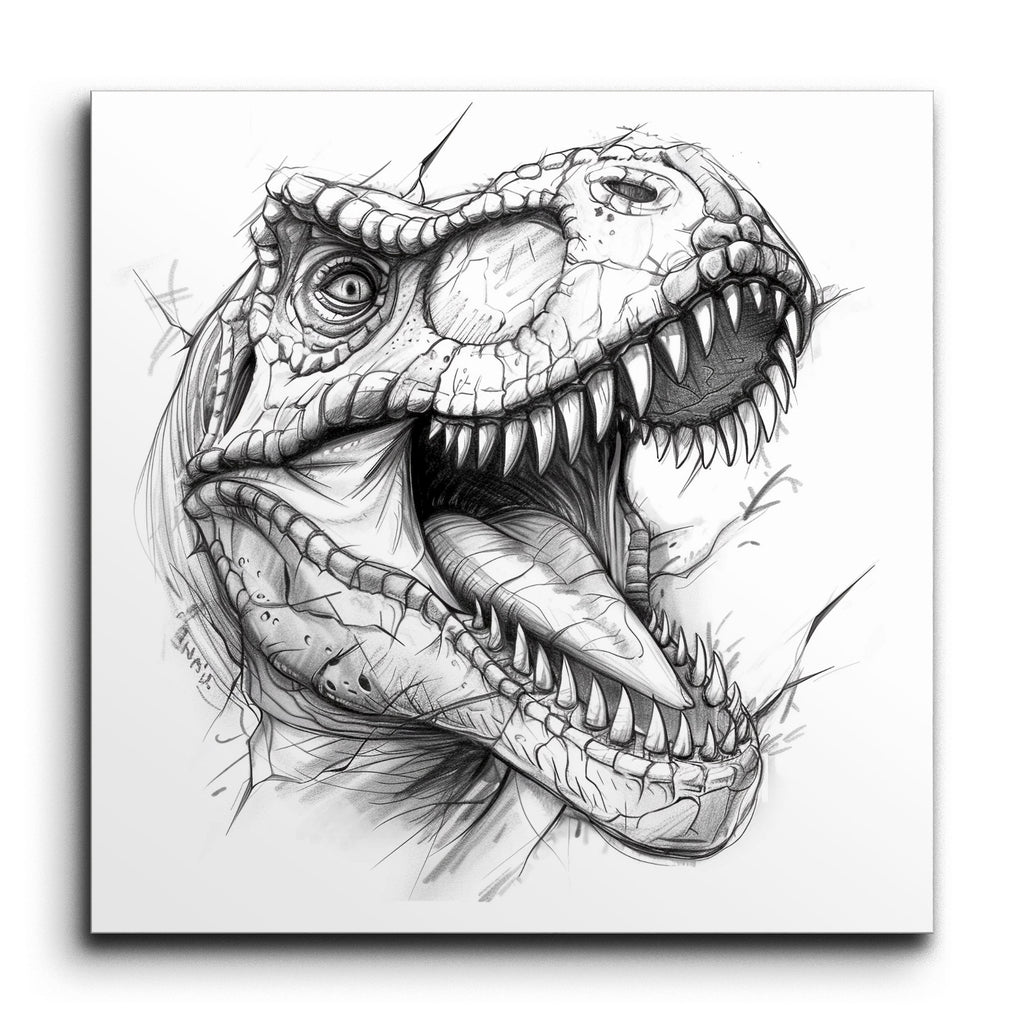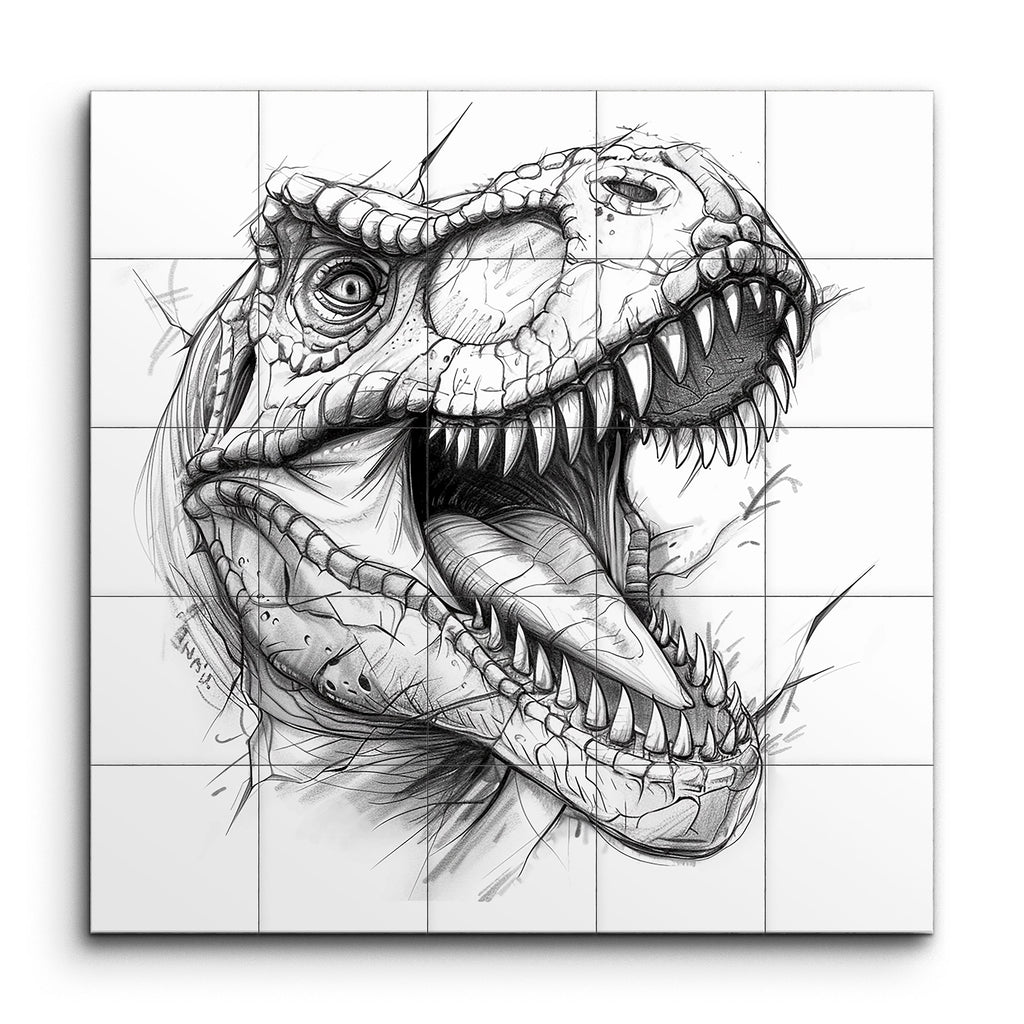 Unleash the primal power of the prehistoric era with this stunning tile mural featuring a roaring Tyrannosaurus rex. Rendered in a highly detailed and dynamic sketch style, the T. rex's fierce gaze and jagged teeth are captured with exceptional artistry. The intricate lines and textured scales bring a rugged, three-dimensional realism to the piece, while the dramatic black and white contrast enhances the ferocity and movement of this iconic dinosaur. Perfect for any space needing a touch of ancient, untamed energy.