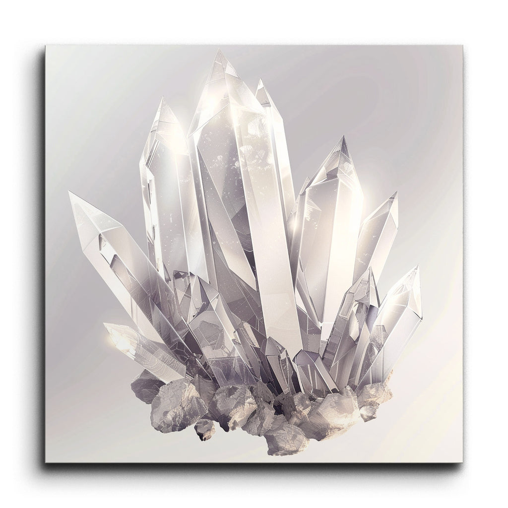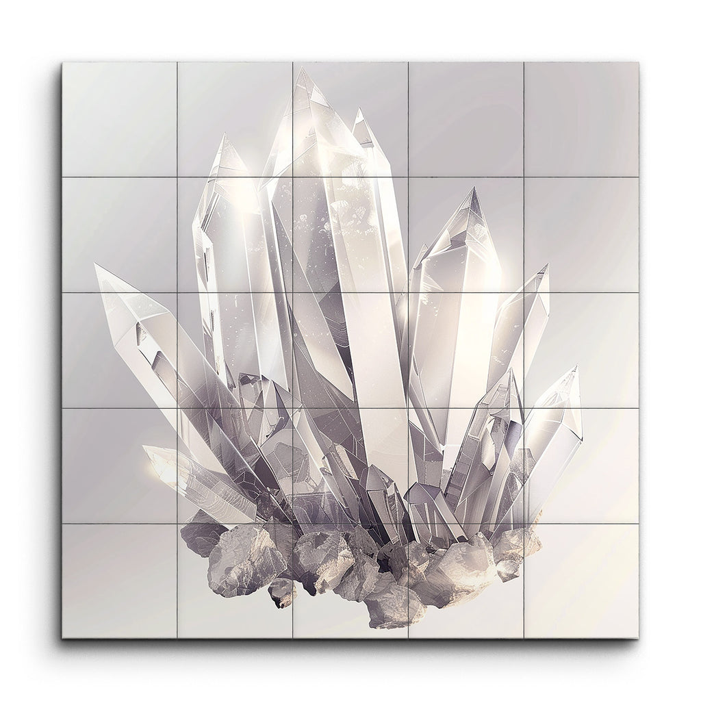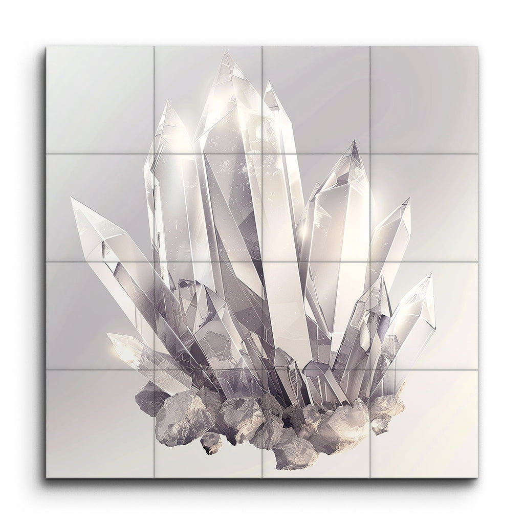 Elevate your space with this breathtaking tile mural featuring a photorealistic cluster of clear quartz crystals. Each crystal is meticulously detailed, showcasing sharp, angular facets and a translucent quality that captures the light beautifully. The rough, earthy base contrasts with the smooth, glass-like crystals, emphasizing their natural beauty. The cool, neutral color palette and balanced composition draw the eye upward, creating a captivating focal point that exudes clarity and purity.