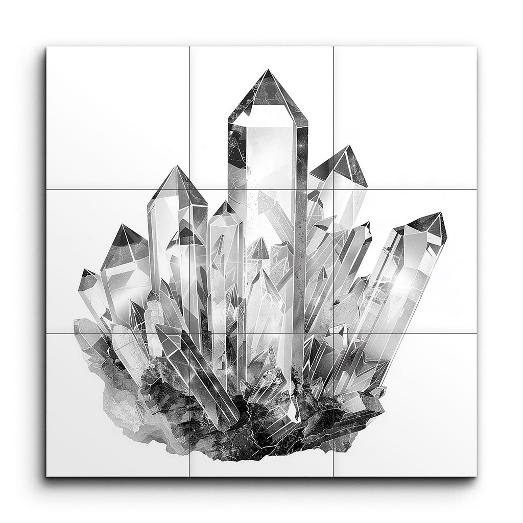 Transform your space with this stunning tile mural, featuring a photorealistic depiction of a cluster of clear quartz crystals. Each crystal, varying in size and shape, is intricately detailed with sharp edges and facets that brilliantly catch and reflect light. The transparency and clarity of the crystals are masterfully rendered, offering a profound sense of depth and dimension. The rough, textured base contrasts beautifully with the polished crystal points, creating a captivating, lifelike representation that brings the serene beauty of nature indoors.