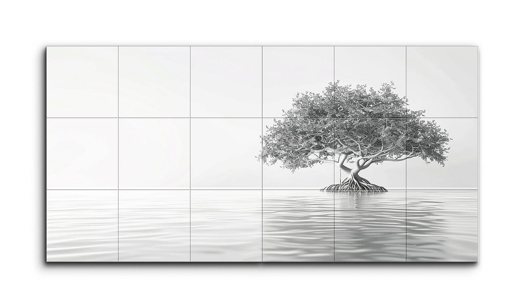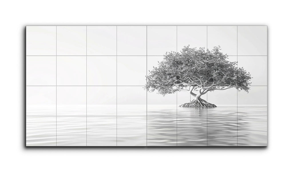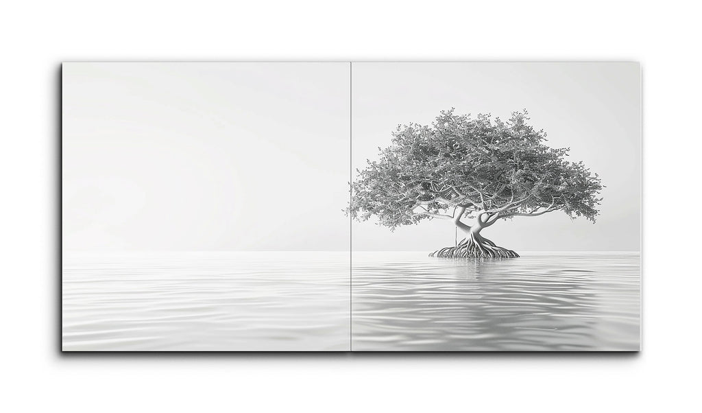 This diptych tile mural features a solitary tree, possibly a mangrove, with submerged roots, rendered in exquisite detail. The monochromatic grayscale palette highlights the intricate textures of the bark and leaves, creating a minimalist and modern aesthetic. The calm water with gentle ripples reflects the tree, adding to the tranquil and reflective mood. The central placement of the tree and its mirrored reflection create a harmonious, balanced composition that invites contemplation.
