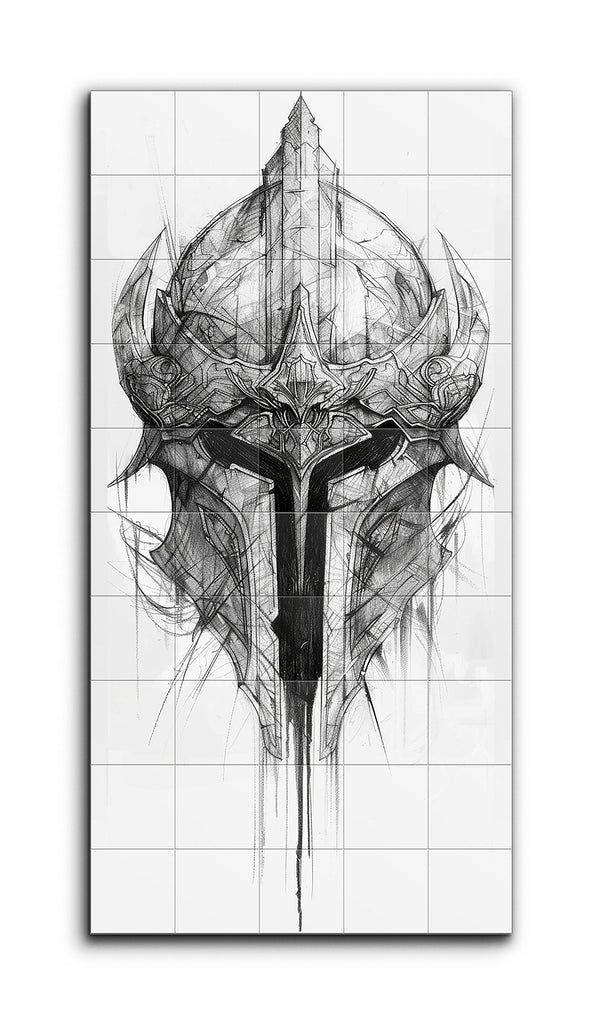 The artwork showcases a highly detailed and intricate helmet, evoking the grandeur of medieval or fantasy armor. A central ridge runs vertically, with elaborate, sharp, and angular designs extending outward, creating a fierce and imposing look. The top features a pointed, crown-like structure with intricate patterns, while the sides flare out with sharp, wing-like extensions. The T-shaped visor is solid black, contrasting starkly with the detailed line work, adding depth and drama. The meticulous shading and fine lines give the helmet a three-dimensional, realistic appearance, blending elements of realism and fantasy to create a visually compelling piece.