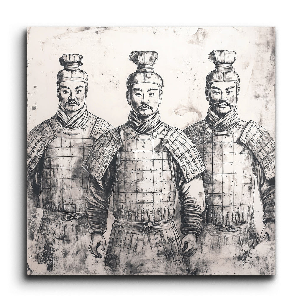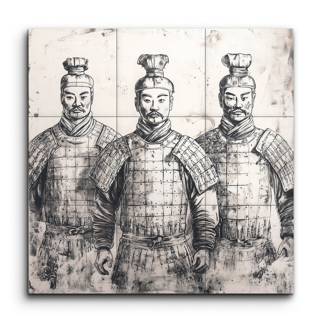 This tile mural features a striking monochromatic artwork of three figures in traditional armor, echoing the iconic Terracotta Warriors. The figures exude a regal and authoritative presence with their calm, stoic expressions and neatly groomed facial hair. Detailed armor, including grid-patterned chest plates and layered shoulder guards, is depicted with bold, confident lines and subtle shading, adding depth and texture. The sketch-like style imbues the scene with a sense of historical reverence and strength.