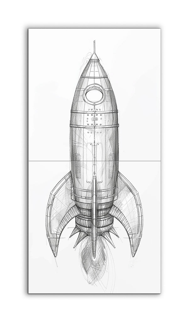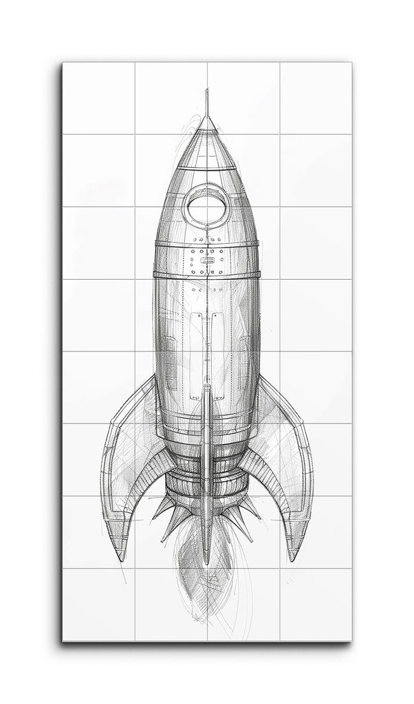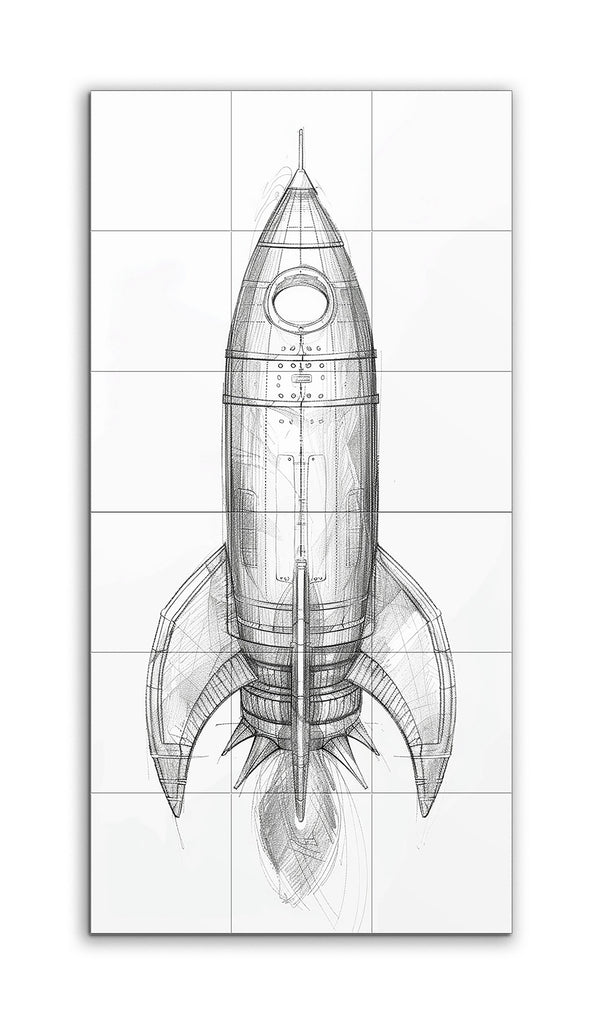 This tile mural showcases a meticulously detailed sketch of a rocket, capturing the essence of mid-20th-century science fiction with its retro-futuristic design. The cylindrical body, segmented with horizontal lines, tapers to a pointed nose cone, punctuated by a circular window. Prominent, curved fins extend from the lower section, enhancing the vintage aesthetic. The monochromatic, pencil-drawn style, complete with precise lines, shading, and cross-hatching, gives the rocket a three-dimensional, blueprint-like appearance.