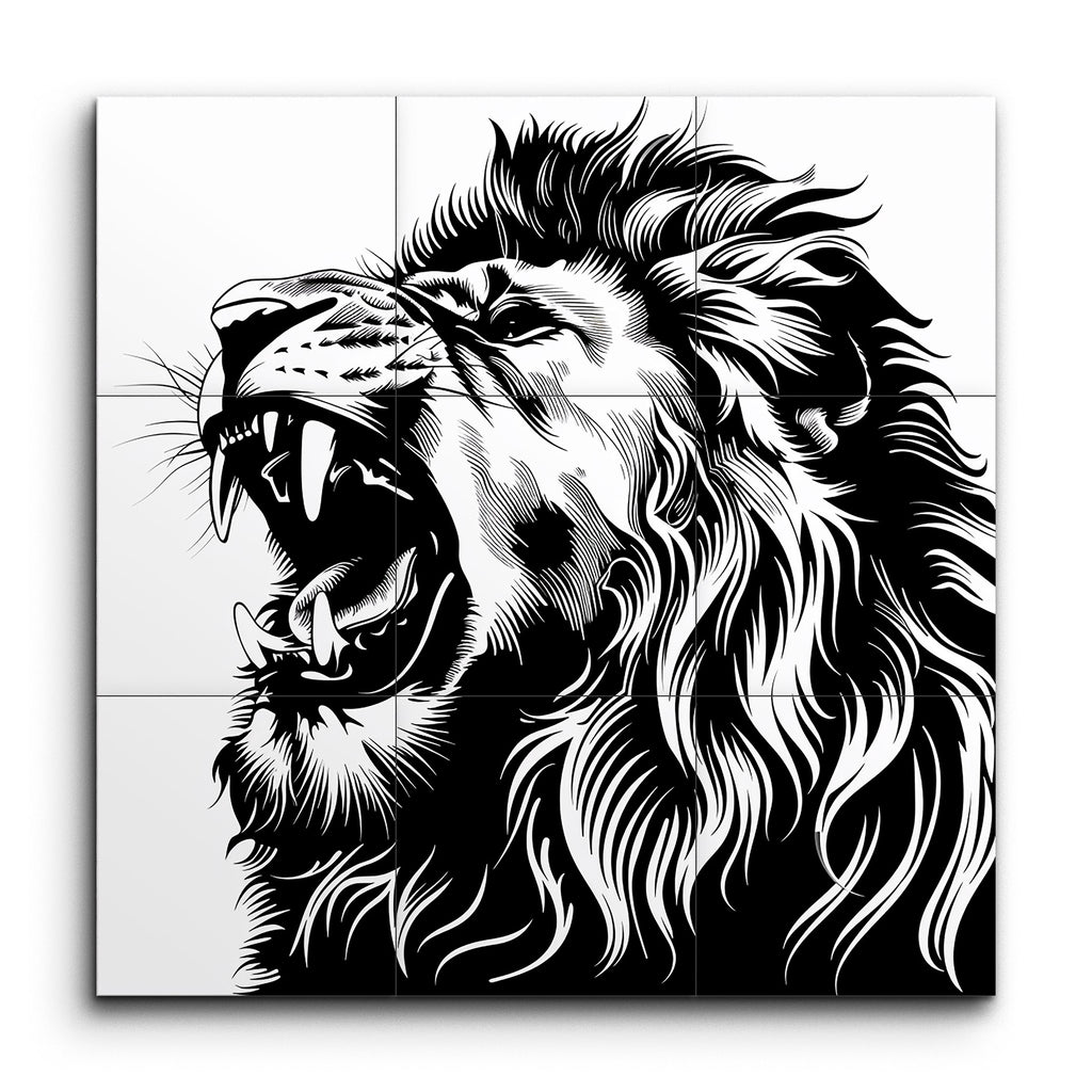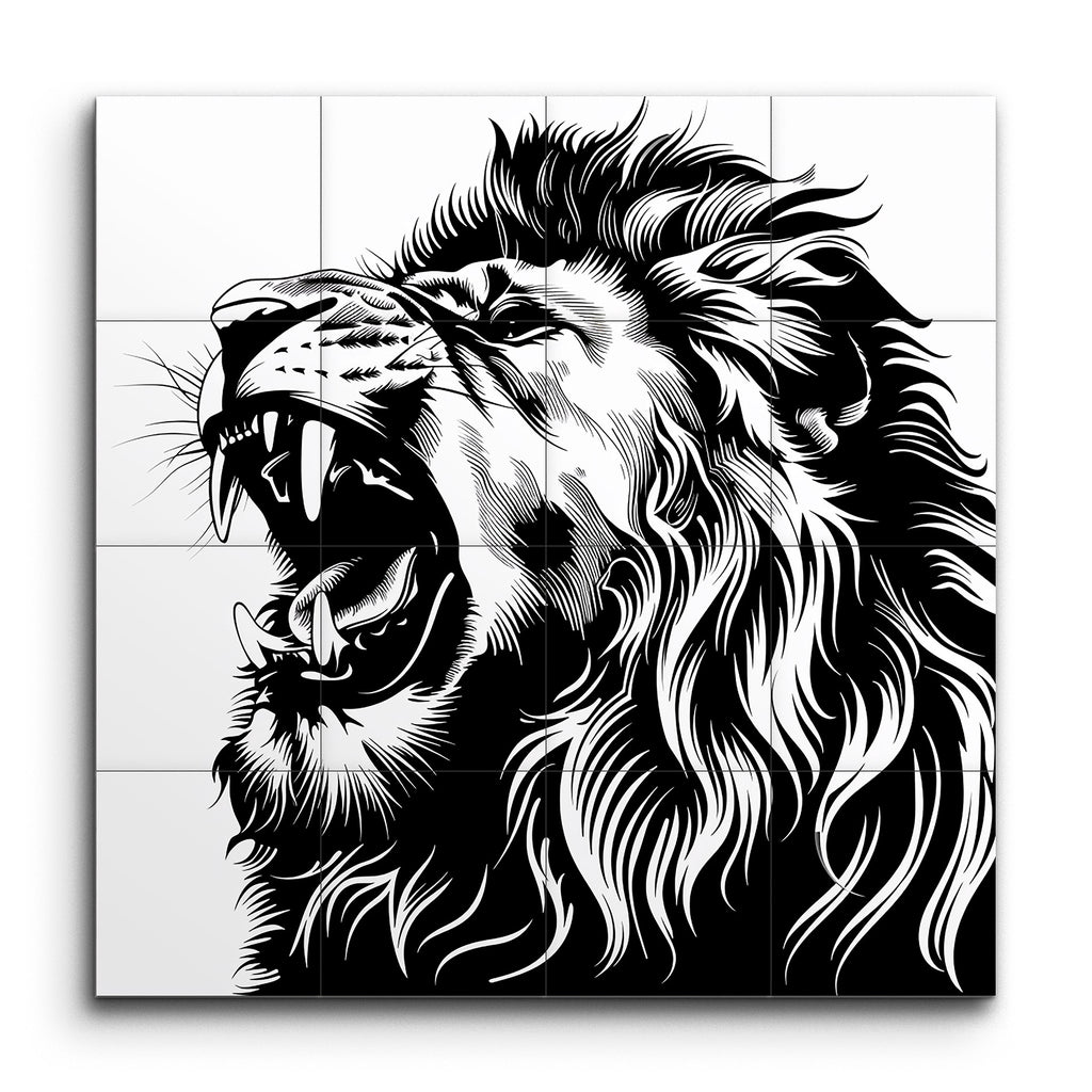 Unleash the wild beauty of nature with this stunning tile mural featuring a roaring lion. The highly detailed and dynamic illustration captures the raw power and majesty of the king of the jungle. The lion’s open mouth and sharp teeth, combined with the flowing, intricate lines of its mane, create a sense of movement and texture. The dramatic black and white contrast, reminiscent of traditional woodcut prints, emphasizes the lion's fierce intensity, making this mural a striking centerpiece for any space.