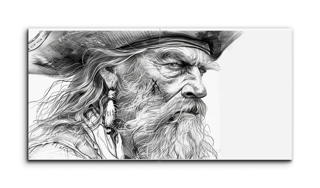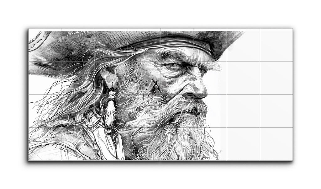 This tile mural features a highly detailed, monochromatic portrait of an elderly man with rugged, weathered features. Executed in a digital or pen-and-ink style, the intricate line work and cross-hatching techniques lend depth and texture to the image. The man, wearing a wide-brimmed hat, has a stern expression, furrowed brow, and a thoughtful gaze. His long, unkempt hair and full beard evoke a historical figure, possibly a cowboy or gold prospector. The masterful use of light and shadow highlights the contours of his face, creating a lifelike and emotionally resonant portrayal.