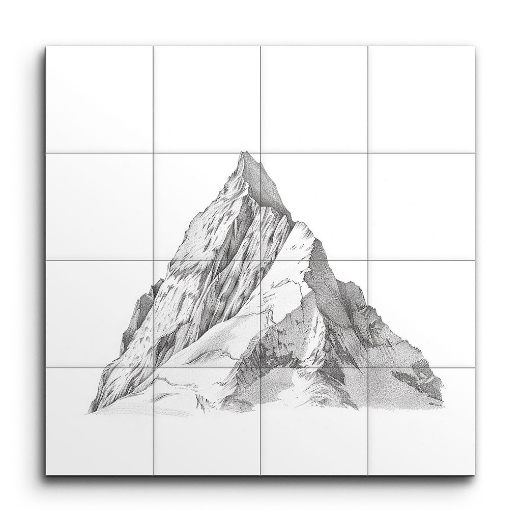 Immerse yourself in the rugged beauty of nature with this stunning tile mural depicting a detailed and realistic illustration of a mountain peak. Rendered in shades of gray, the artwork captures the formidable essence of the jagged, steep slopes through meticulous shading and fine lines. The hatching and cross-hatching techniques enhance the texture, making the rocky surfaces and varied terrain come alive. This monochromatic masterpiece invites you to explore the intricate contours and ridges, highlighting the artist's exceptional skill and attention to detail.