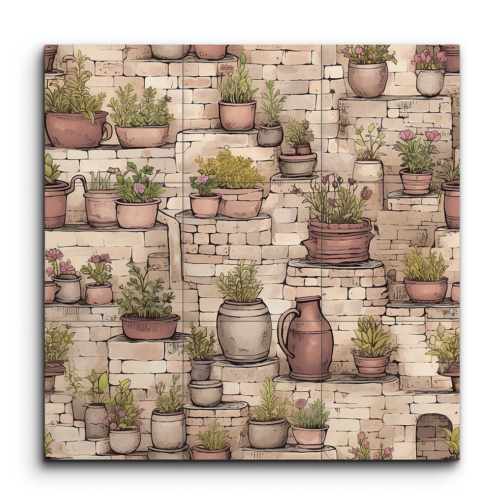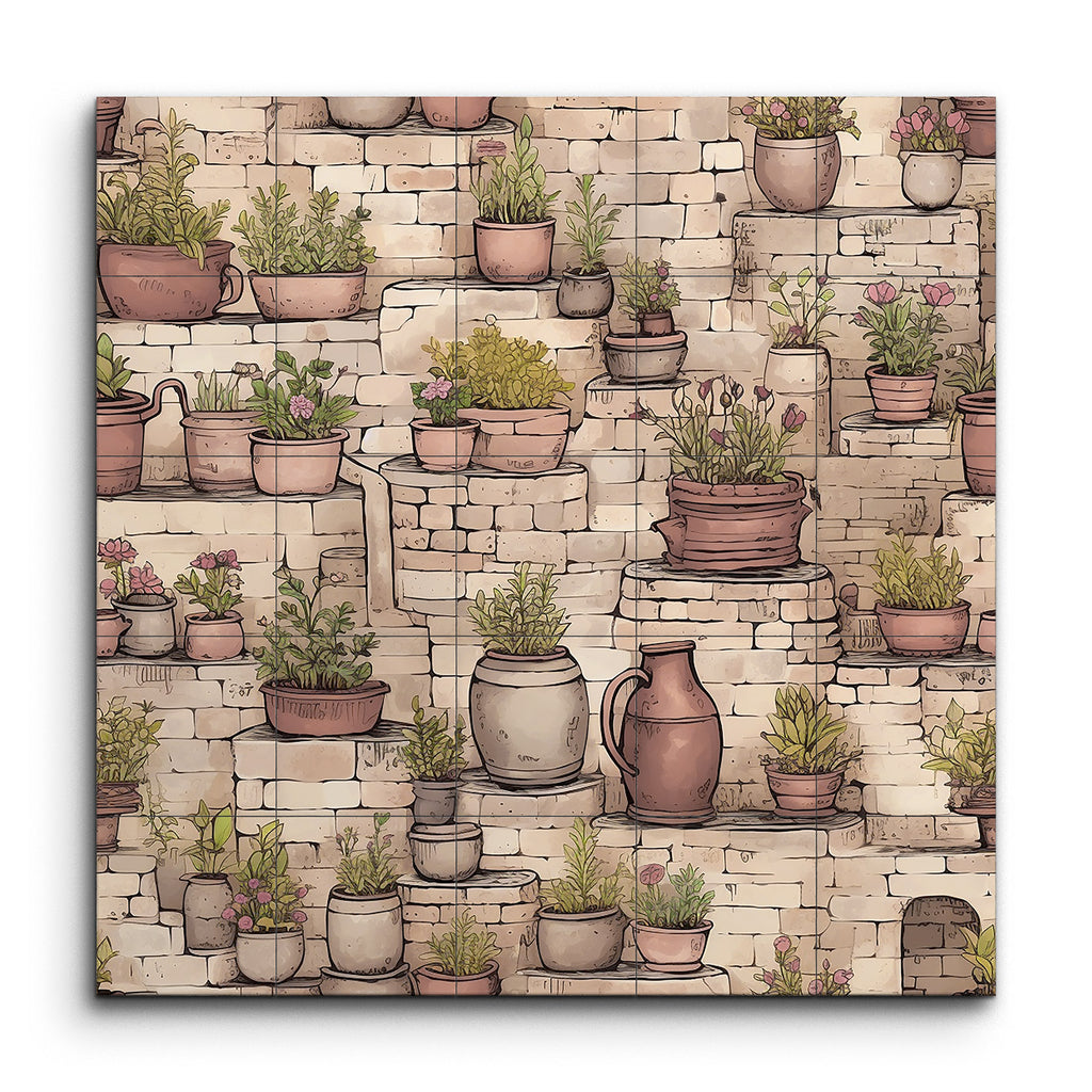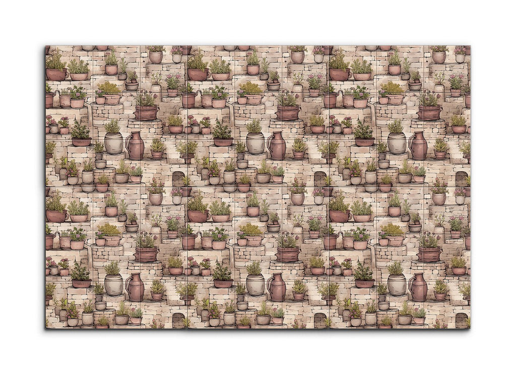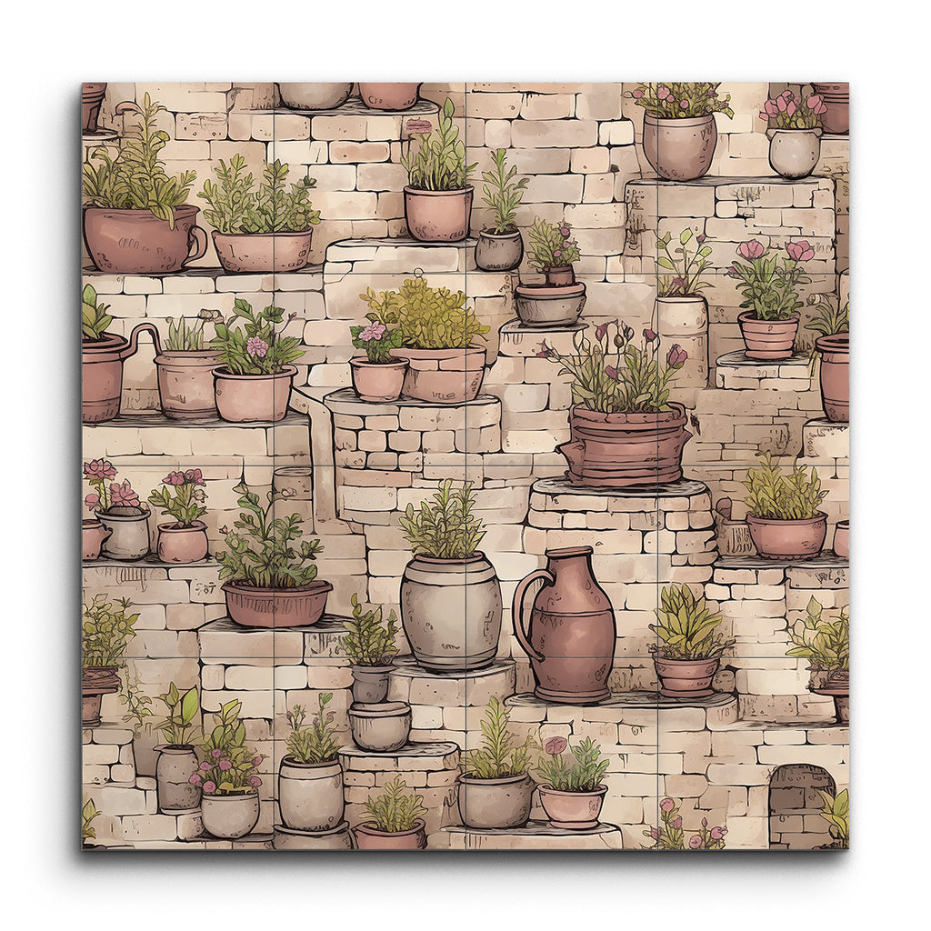 Transform your space with this enchanting tile mural, capturing a rustic garden scene. Charming potted plants in various sizes and earthy tones grace stone steps and ledges, their vibrant greens and blooming flowers creating a lively contrast against the textured, aged stones. Detailed and illustrative, this artwork balances fine lines and shading, bringing depth and dimension to your walls. Perfect for evoking the tranquility and charm of a quaint garden or courtyard.