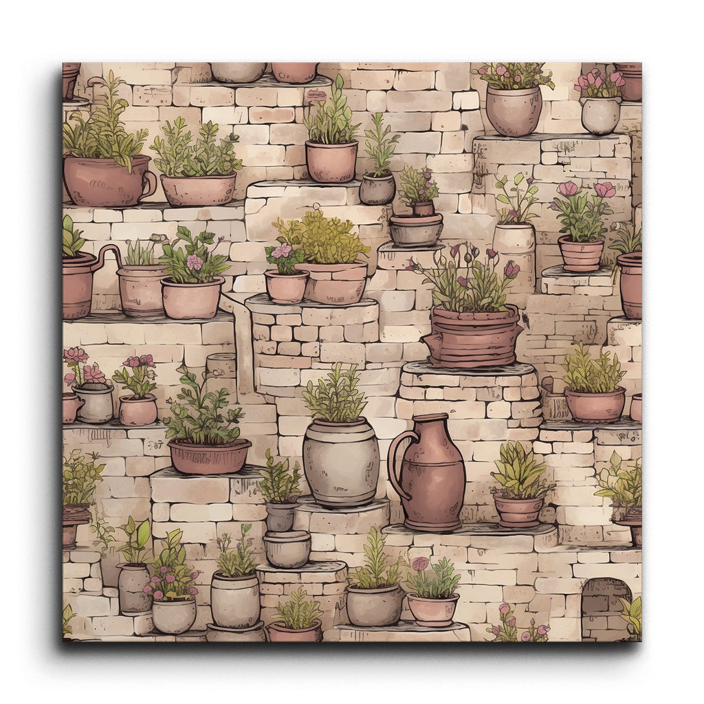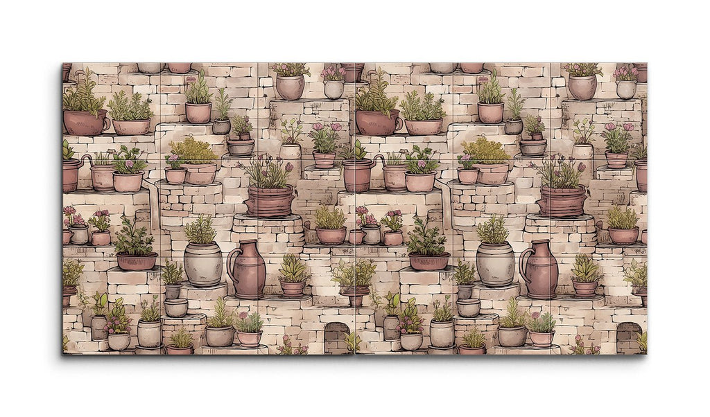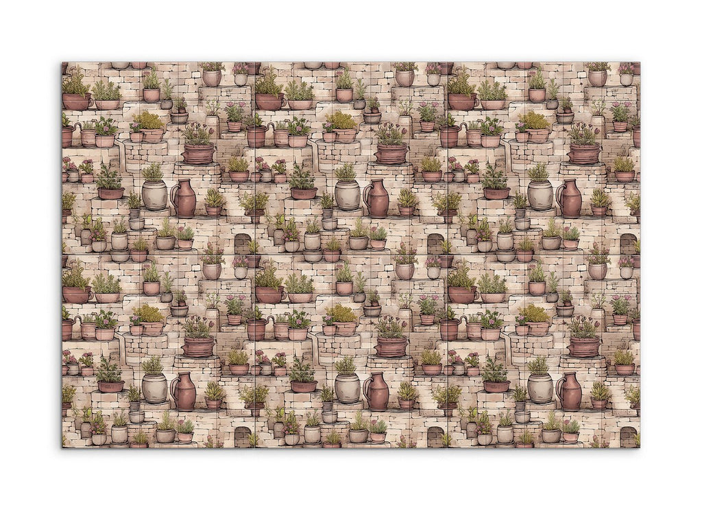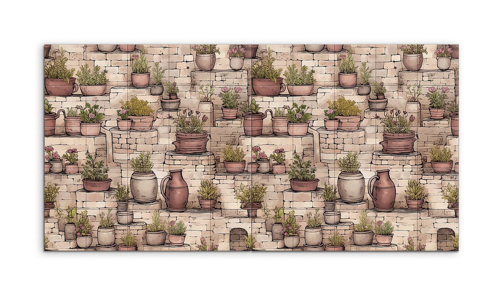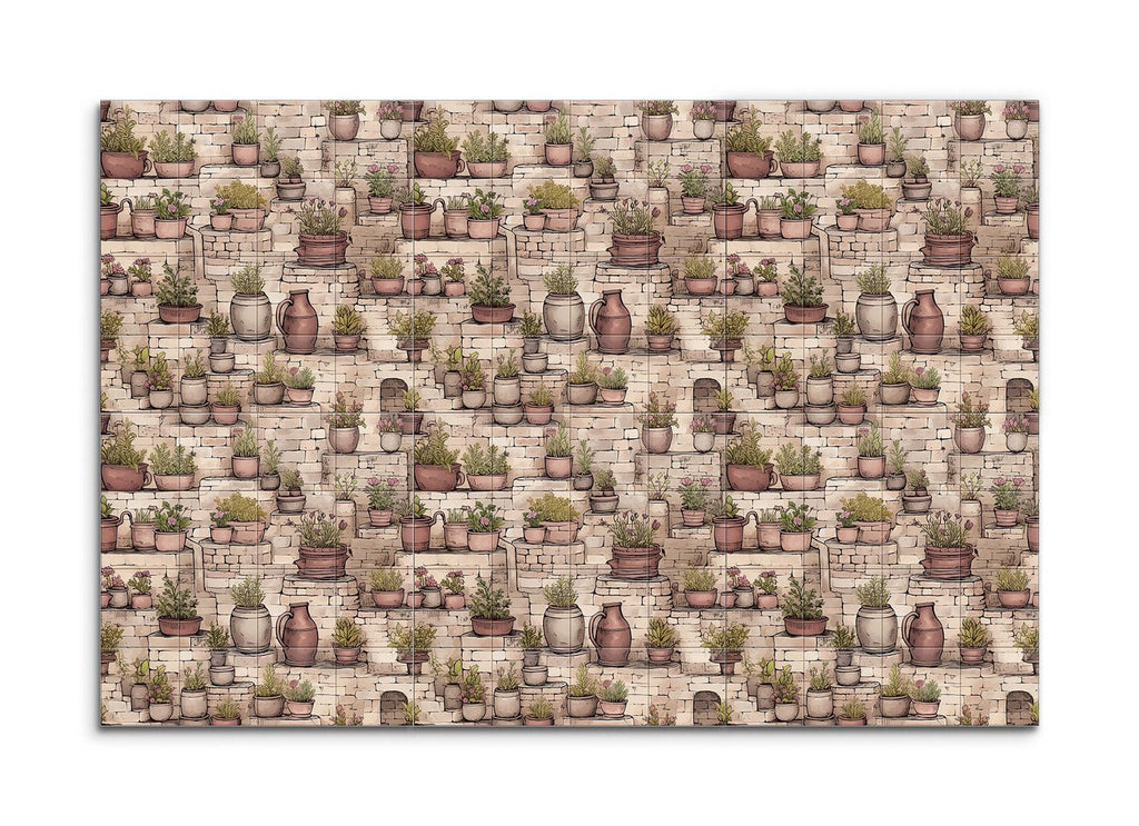 Transform your space with this enchanting tile mural, capturing a rustic garden scene. Charming potted plants in various sizes and earthy tones grace stone steps and ledges, their vibrant greens and blooming flowers creating a lively contrast against the textured, aged stones. Detailed and illustrative, this artwork balances fine lines and shading, bringing depth and dimension to your walls. Perfect for evoking the tranquility and charm of a quaint garden or courtyard.