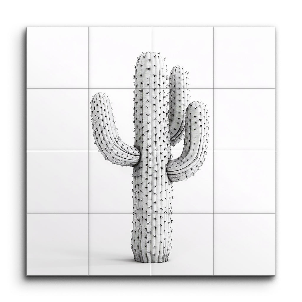 This tile mural showcases a hyperrealistic depiction of a saguaro cactus, renowned for its towering, columnar form and numerous arms. Rendered in a monochromatic palette of grays and blacks, the artwork meticulously captures the cactus's ribbed texture and uniformly distributed spines. The careful placement of shadows and highlights gives the cactus a striking three-dimensional effect. With its minimalistic composition, the mural invites viewers to fully appreciate the intricate details and lifelike quality of this iconic desert plant.
