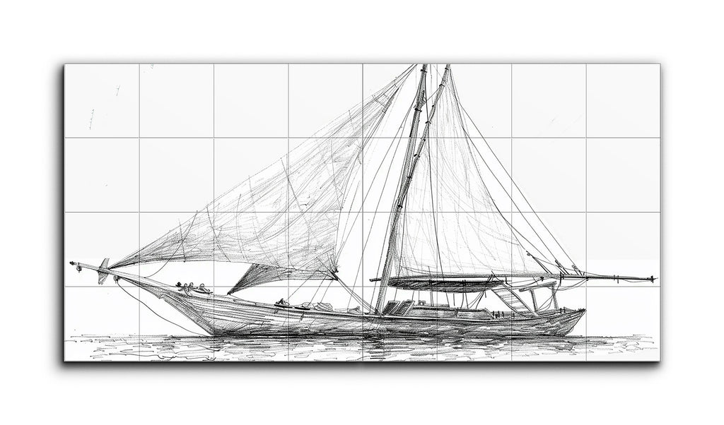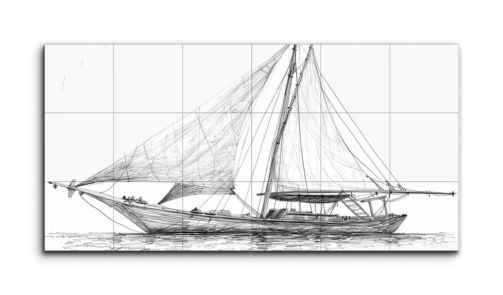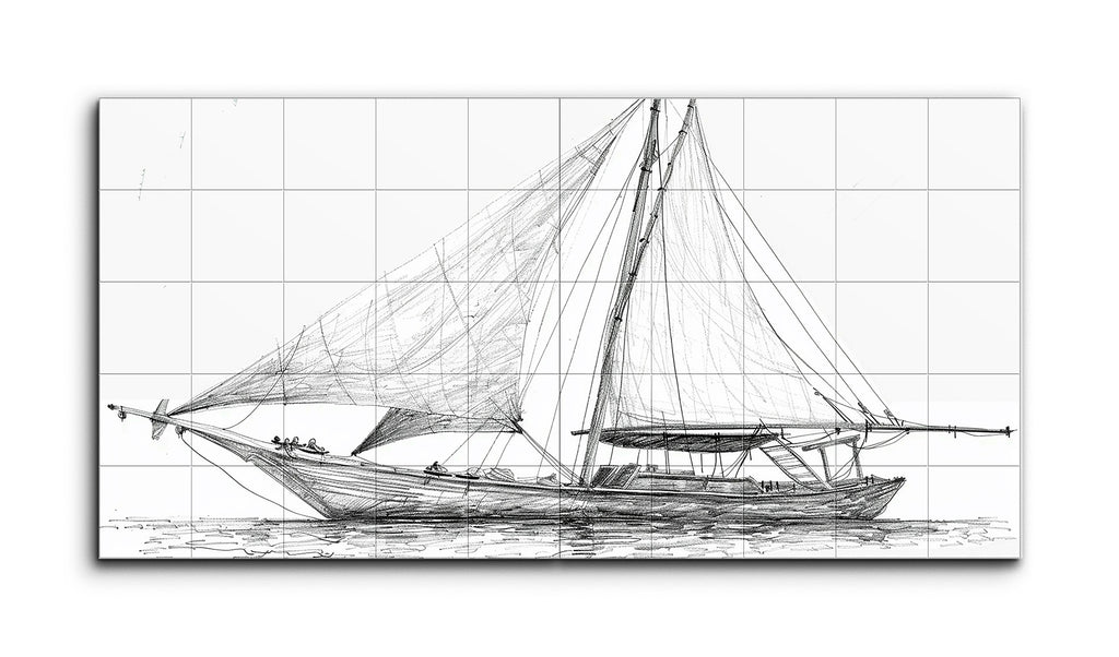 This tile mural features a meticulously detailed sketch of a sailboat, rendered in a realistic style with fine, precise lines. The prominent main sail extends from the mast to the bow, while a smaller secondary sail is positioned towards the stern. The boat's wooden hull is intricately drawn, showcasing its curvature and texture. Light horizontal strokes suggest calm water beneath the boat. Monochromatic line work, reminiscent of technical drawings, emphasizes depth, shadow, and texture, creating a balanced and harmonious composition.