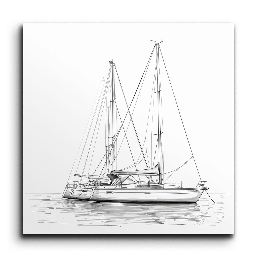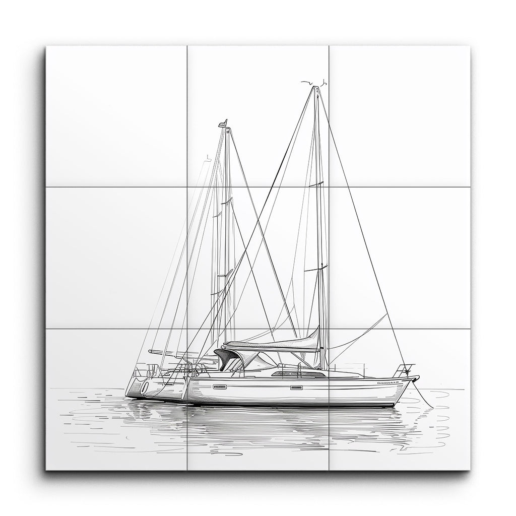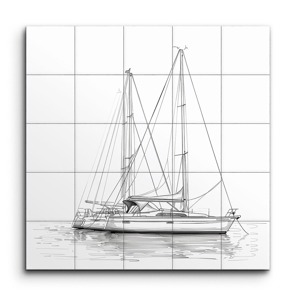 Immerse yourself in the serene beauty of nautical elegance with our stunning tile mural featuring a detailed line drawing of a sailboat. The minimalist artwork captures the sleek, modern design of the vessel, with its two tall masts and intricate rigging. The clean, precise lines create a technical, architectural feel, while the subtle reflection on the water adds a calming touch. This monochrome masterpiece focuses on essential elements, enhancing its simplicity and timeless elegance.