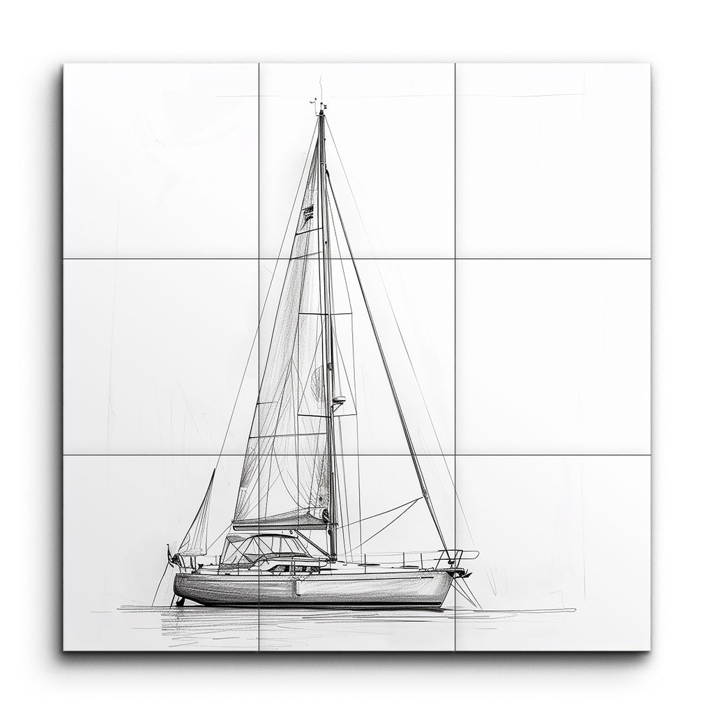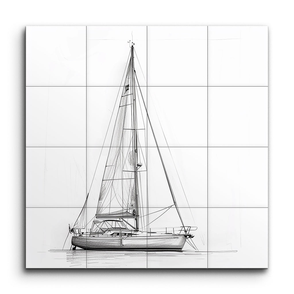 Immerse yourself in the serene elegance of maritime life with this exquisite tile mural, featuring a detailed line drawing of a sailboat. This minimalist artwork captures the essence of nautical precision through clean, sharp lines that highlight the boat's hull, mast, and sails. Intricate rigging and fine shading lend a three-dimensional quality, while the balanced composition and subtle water reflection evoke a calm, anchored stillness. Perfect for those who appreciate the technical beauty and tranquility of the sea.