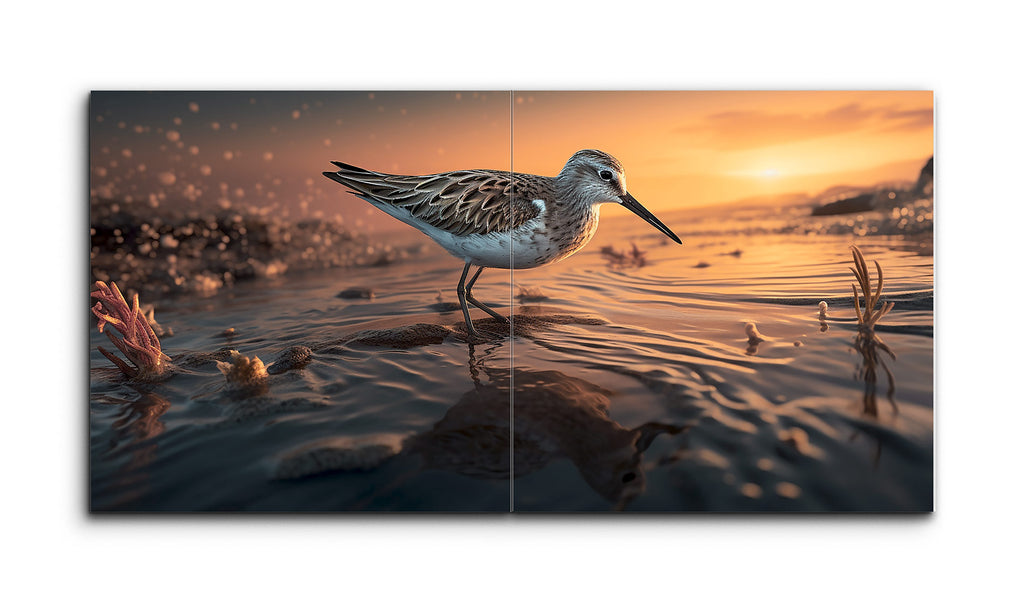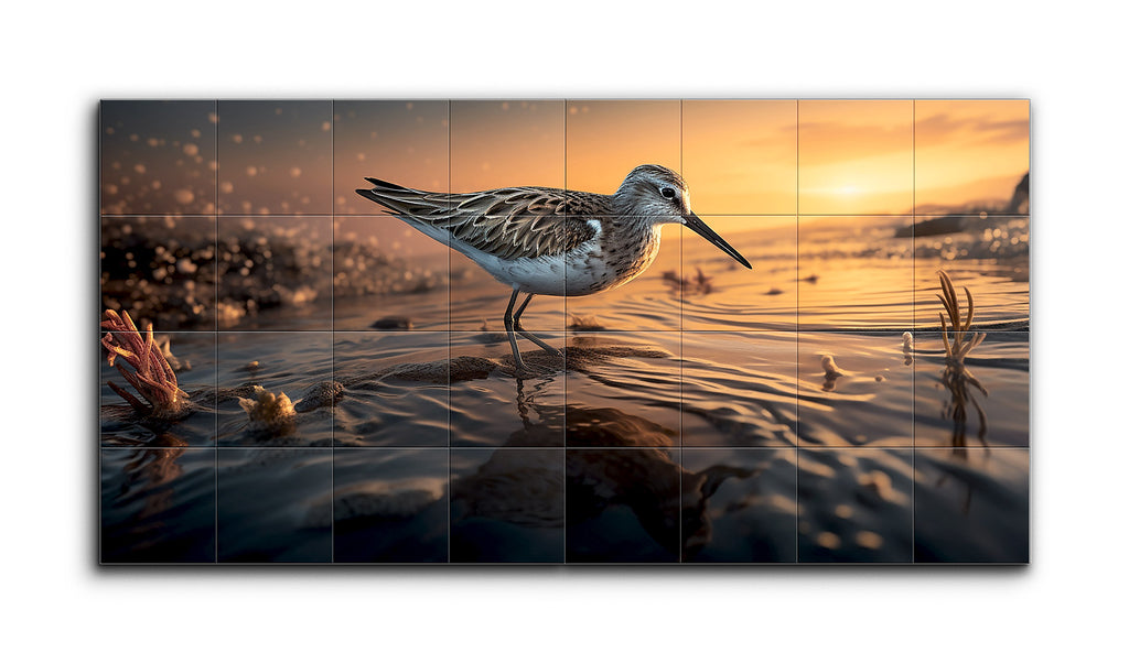 This tile mural captures a sandpiper wading through shallow waters at dusk. The setting sun casts a golden glow, reflecting off the water and creating a tranquil atmosphere. The bird, depicted mid-step with one foot raised, has intricately detailed plumage in brown, black, and white. The water is textured with gentle ripples and floating debris, enhancing the naturalistic scene. The warm palette of oranges, yellows, and browns evokes a sense of calm, balancing the composition beautifully.