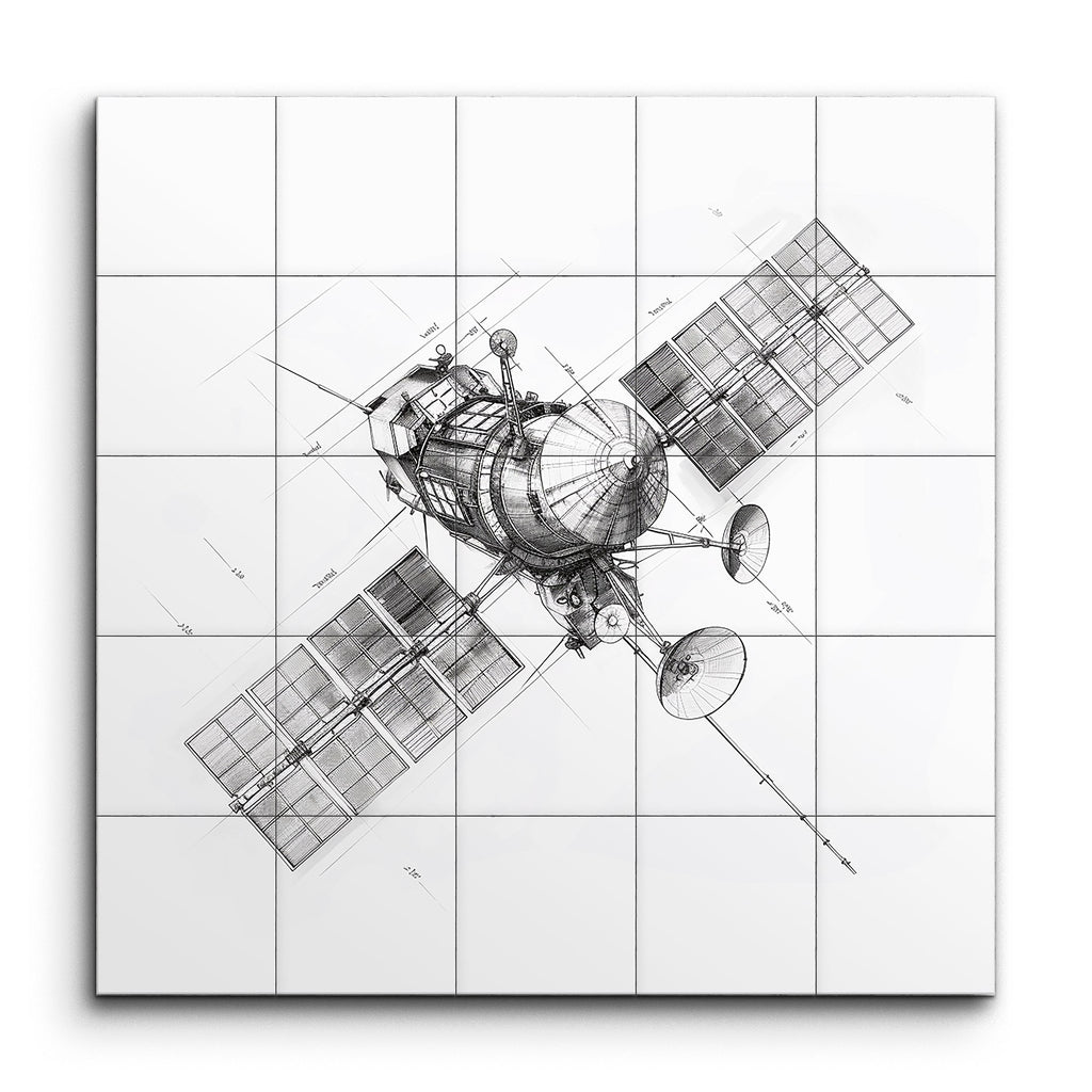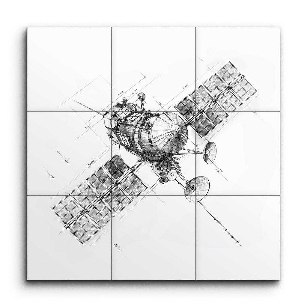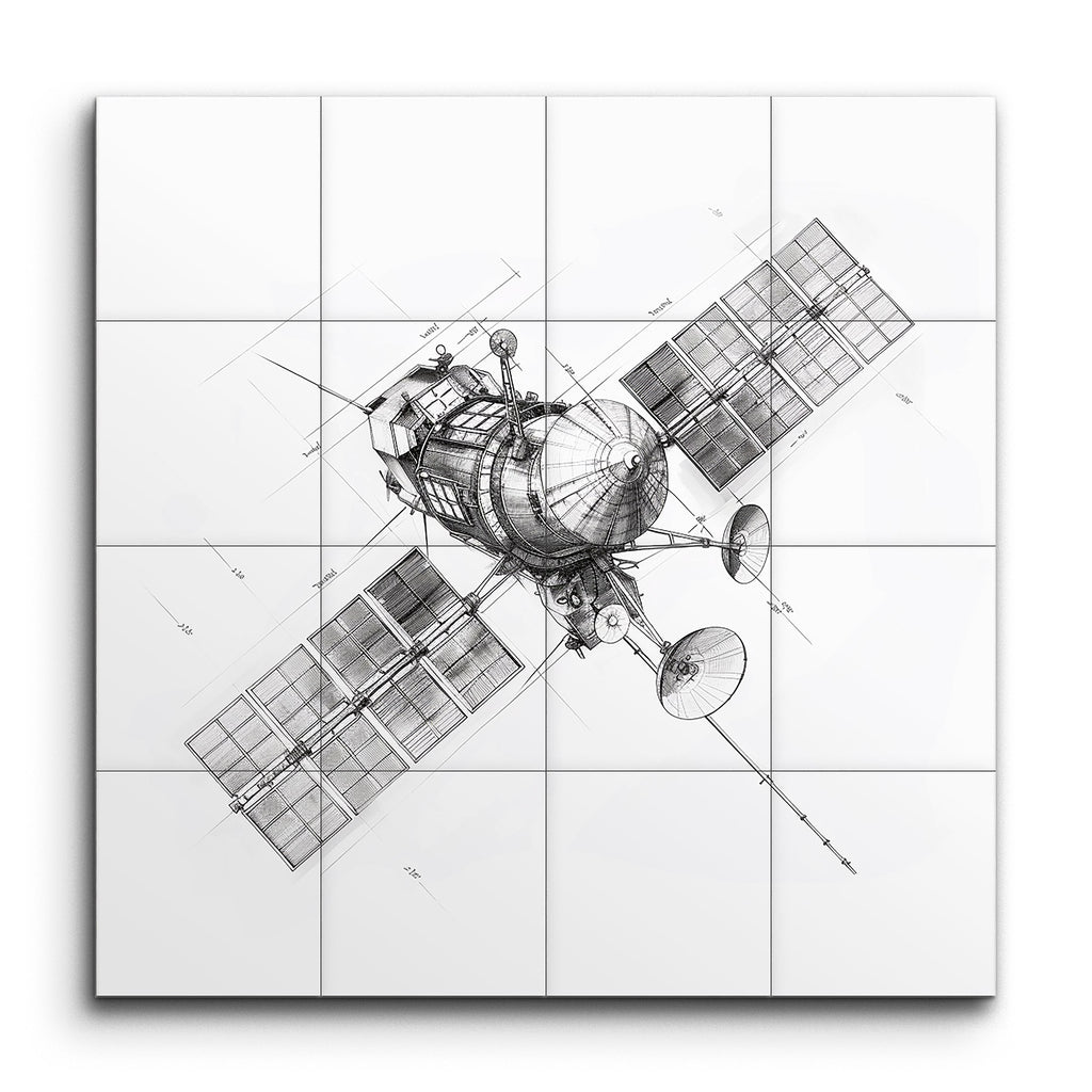 Elevate your space with this stunning tile mural featuring a meticulously detailed technical drawing of a satellite. Inspired by engineering blueprints, the artwork showcases the satellite in a three-dimensional perspective with precise lines and intricate details. From the grid-like solar panels to the cylindrical main body and circular antennas, each component is rendered with remarkable accuracy. The use of shading and line weight adds depth, making this piece a captivating blend of art and science.