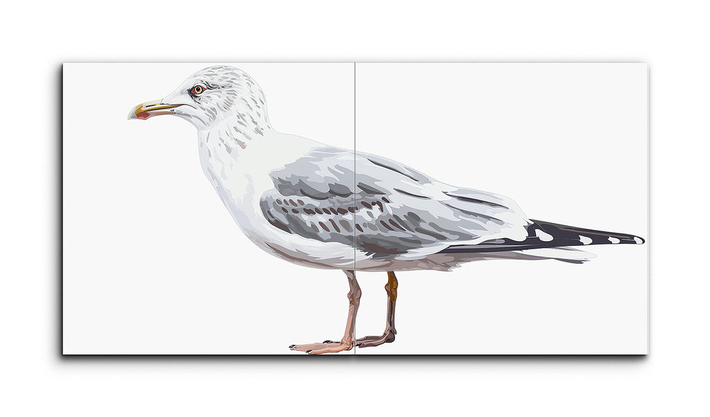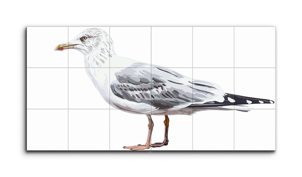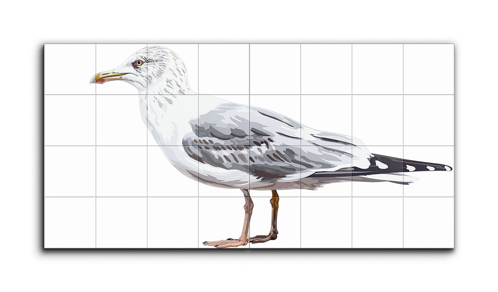This tile mural features a meticulously detailed seagull in profile view, rendered with shades of white, grey, and black that convey texture and depth. The bird's focused eye, yellow beak with a hint of red, and pinkish-orange legs contrast subtly with its cool-toned body. The realistic digital illustration showcases clean lines and smooth gradients, creating a three-dimensional effect. Split across two panels, the seagull's form is emphasized against a plain white background, adding a modern, graphic touch.