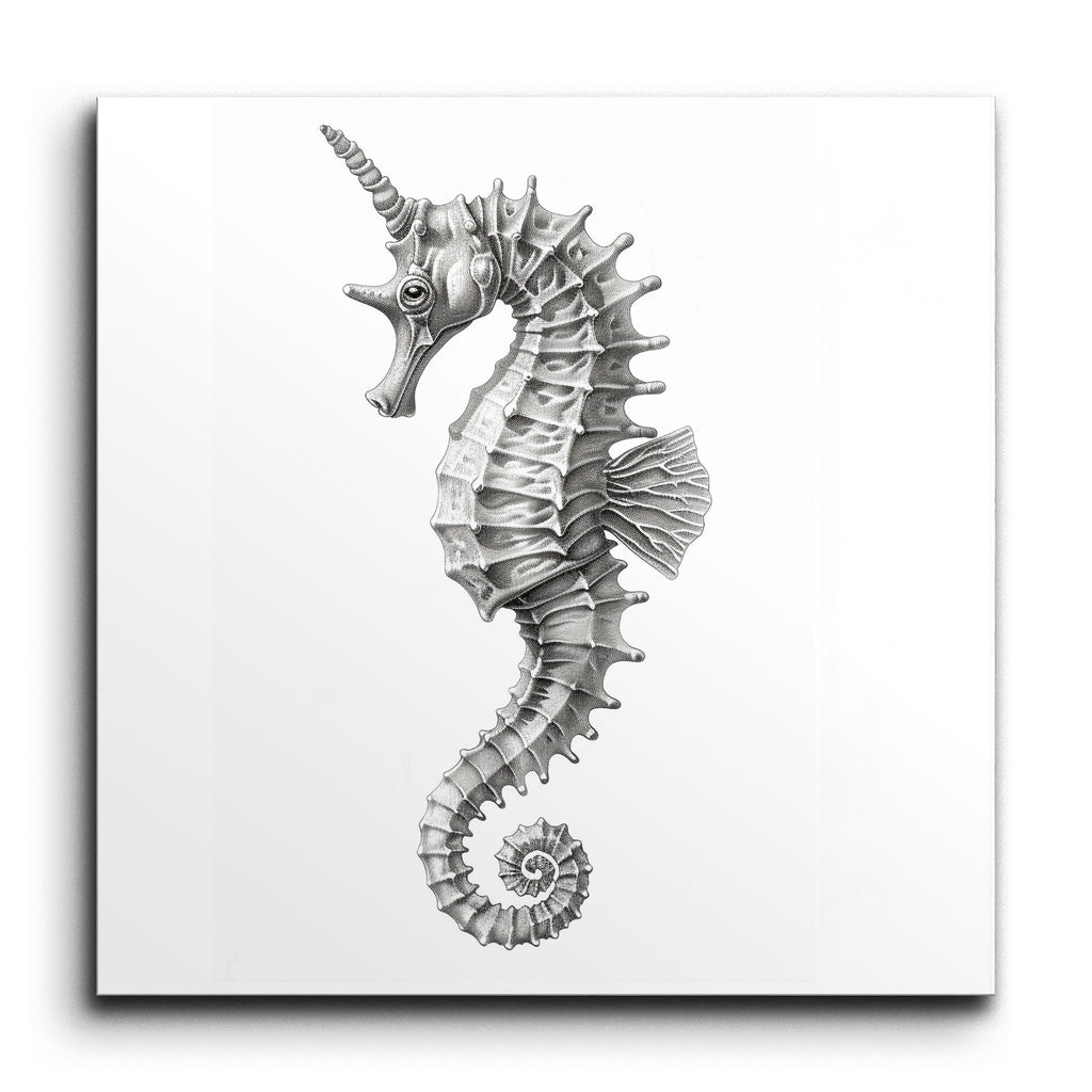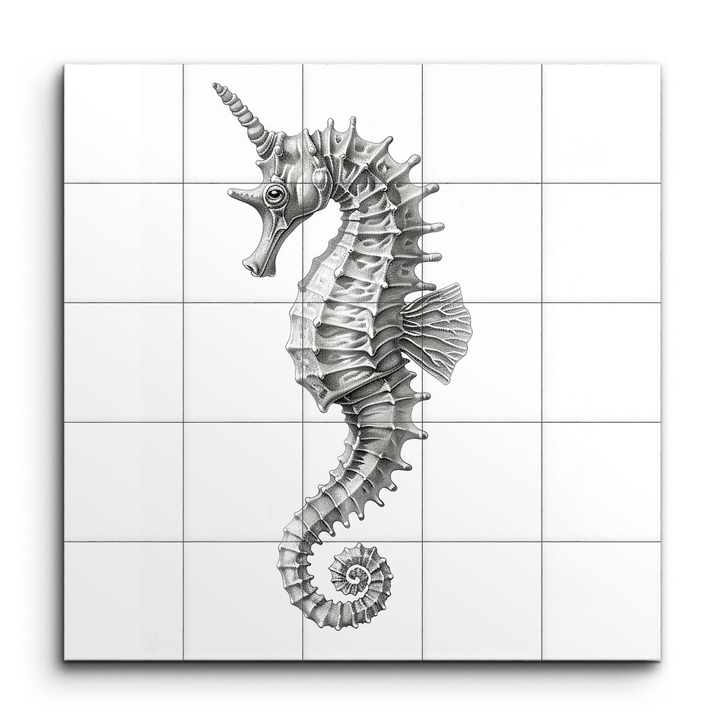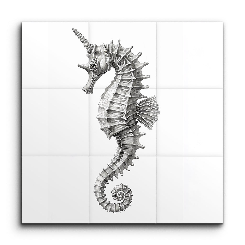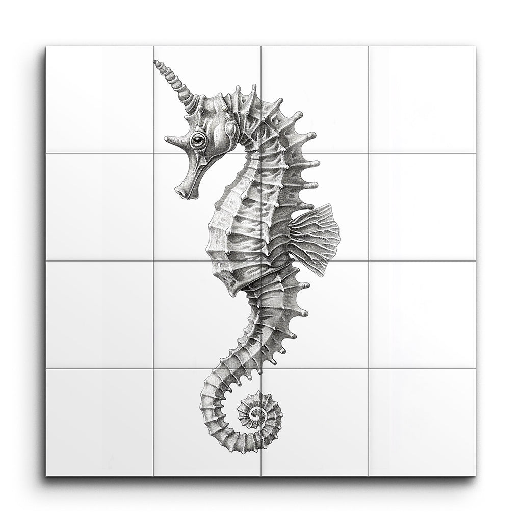 Dive into the mesmerizing world of marine life with this stunning tile mural featuring a meticulously detailed seahorse. Each segmented, bony plate of the seahorse is intricately shaded, creating a textured, almost armor-like appearance. The elongated snout, lifelike eye, and horn-like crown add to its distinctive charm. Delicate lines depict the dorsal fin's membranous structure, while the coiled tail showcases its flexibility. This monochromatic masterpiece captures the natural beauty and intricate details of the seahorse, making it a captivating focal point for any space.