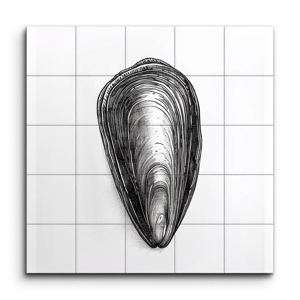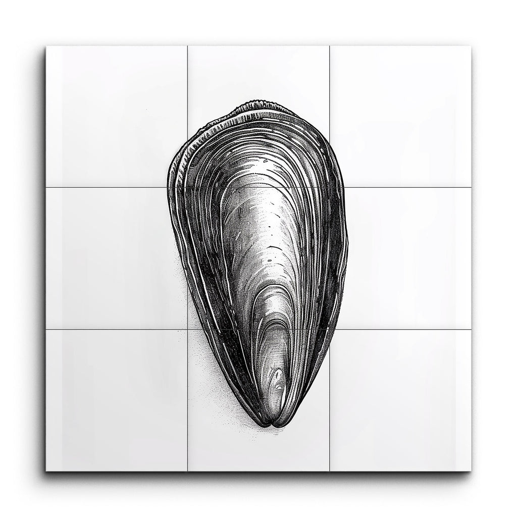 Transform your space with this exquisite tile mural featuring a meticulously detailed black and white illustration of a seashell. The elongated, conical shell, with its slightly curved form, is brought to life through the artist's masterful use of fine lines and shading. Each intricate pattern and texture is rendered with precision, emphasizing the shell's three-dimensional form and natural contours. This realistic depiction captures the delicate beauty of the seashell, adding a touch of nature's elegance to your decor.