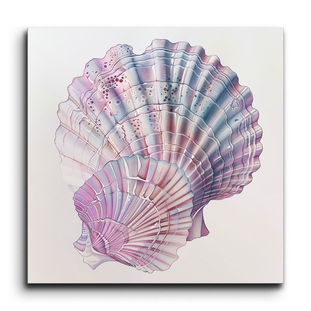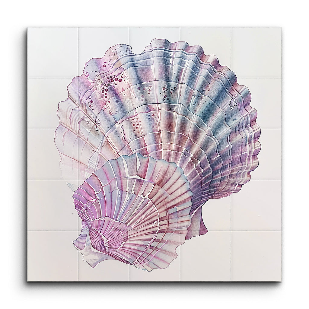 Transform your space with this stunning tile mural featuring two intricately detailed seashells. The artwork showcases a larger and smaller shell, overlapping with lifelike precision. Rendered in a delicate palette of pastel pinks, purples, and blues, the shells exhibit natural textures and patterns with an almost iridescent sheen. The serene and calming aesthetic, with its fine detail and smooth gradients, captures the delicate beauty of marine life, bringing a touch of tranquility to any setting.