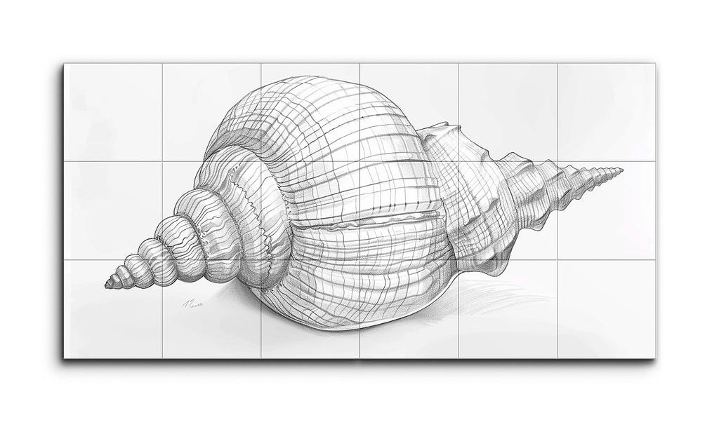 This tile mural features a highly detailed drawing of a seashell, reminiscent of a technical or architectural sketch. Precise lines and a grid overlay emphasize the shell's three-dimensional structure, with curves and contours that highlight its form and dimensions. Fine lines meticulously render the texture and patterns of the shell's surface, using varying line weights to create depth and shadow. Monochromatic shades of black and white enhance the play of light and shadow, making the artwork visually striking and intellectually engaging.