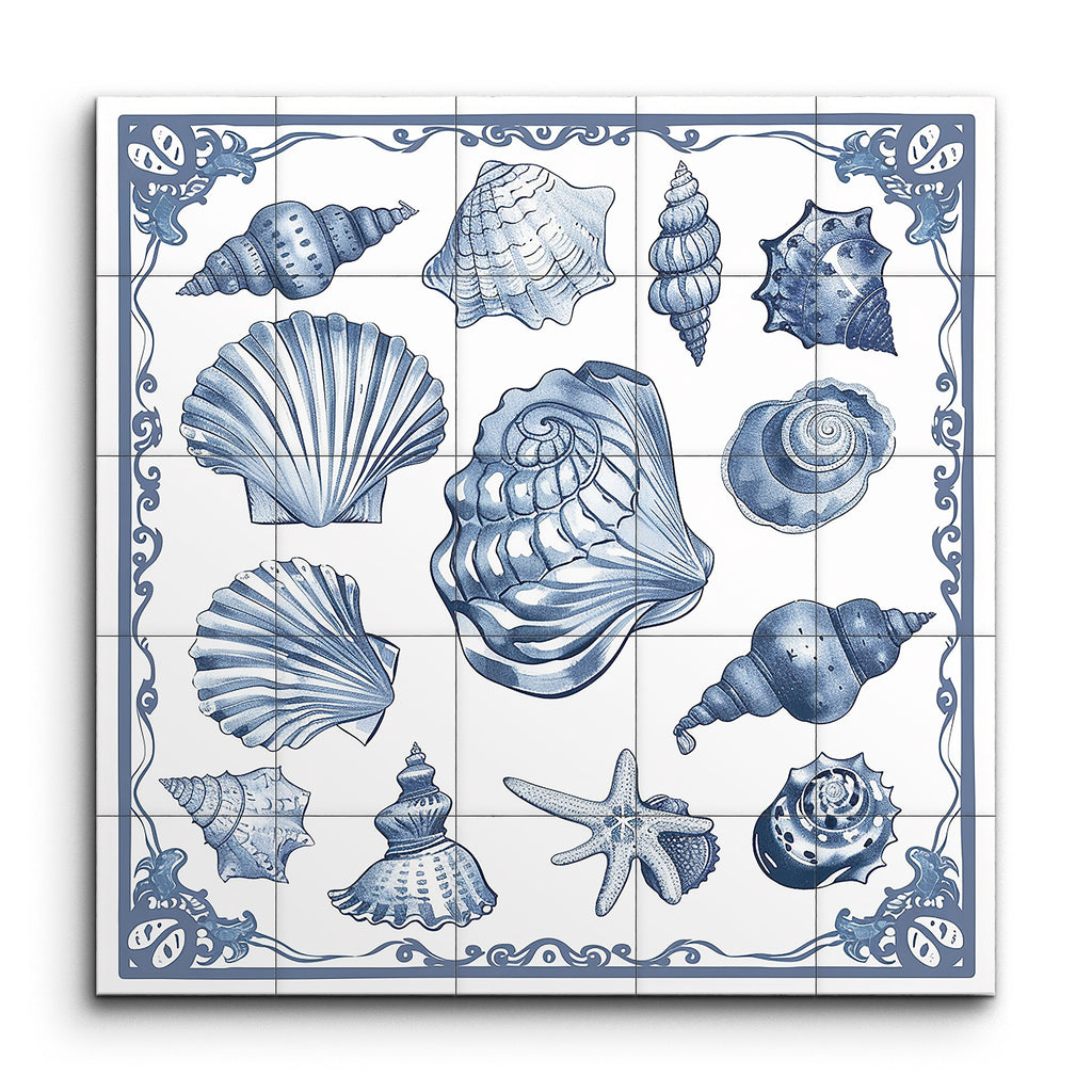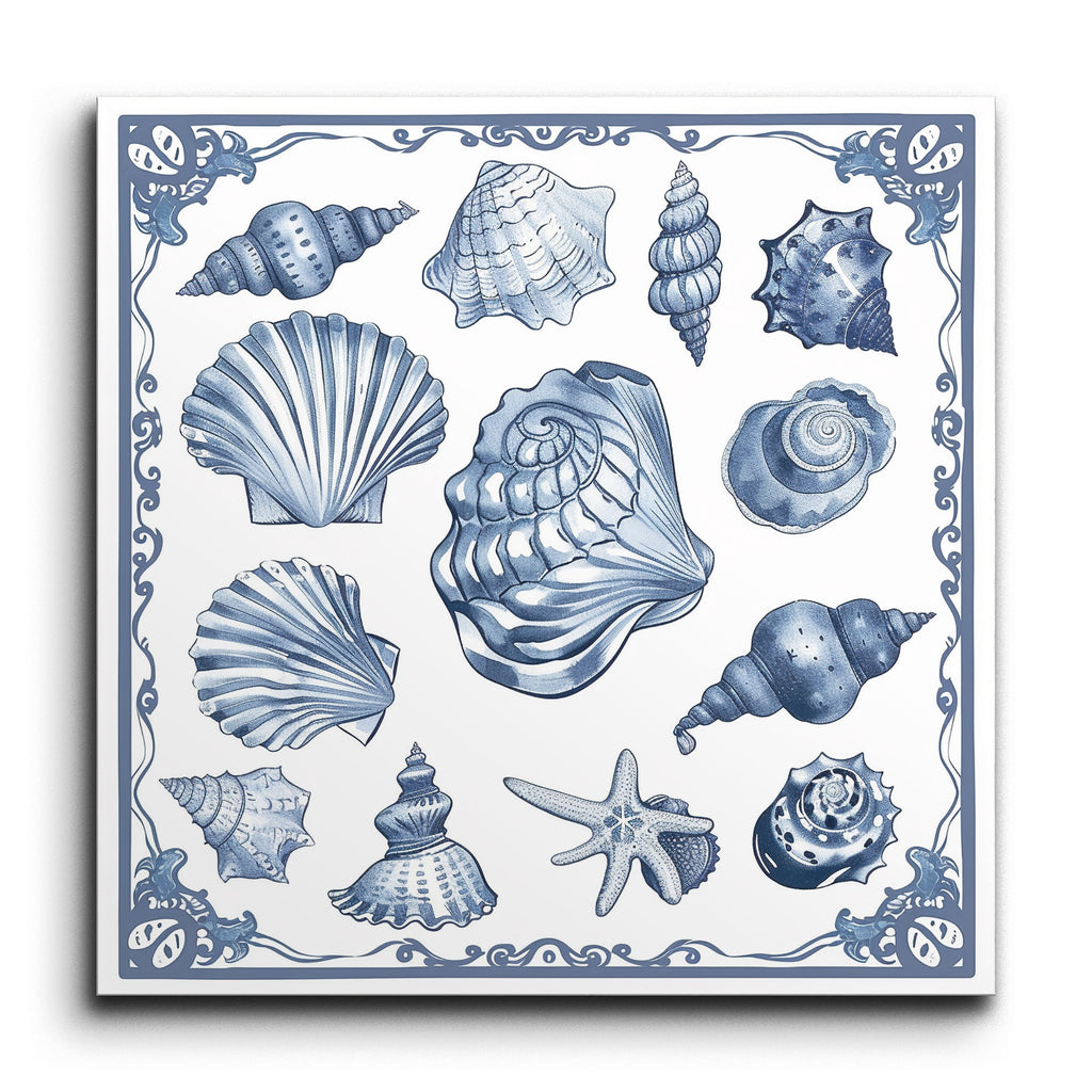 Transform your space with this exquisite tile mural featuring a detailed illustration of various seashells and a starfish in a classic blue and white color scheme. Each shell is meticulously rendered, showcasing unique shapes, textures, and patterns reminiscent of traditional blue and white porcelain. Framed with an ornate, symmetrical border that complements the central illustrations, this mural exudes elegance and timeless sophistication, making it a perfect centerpiece for any setting.