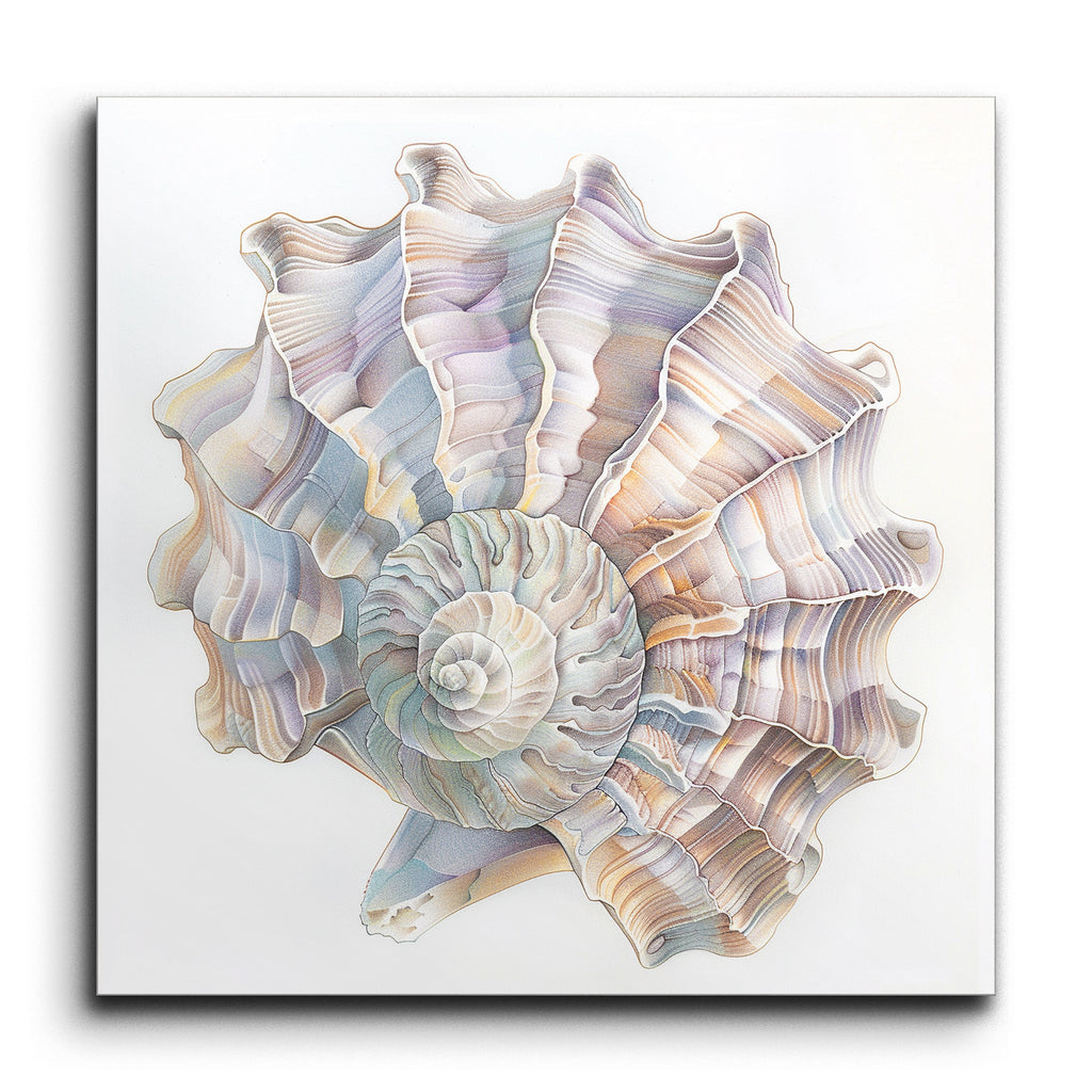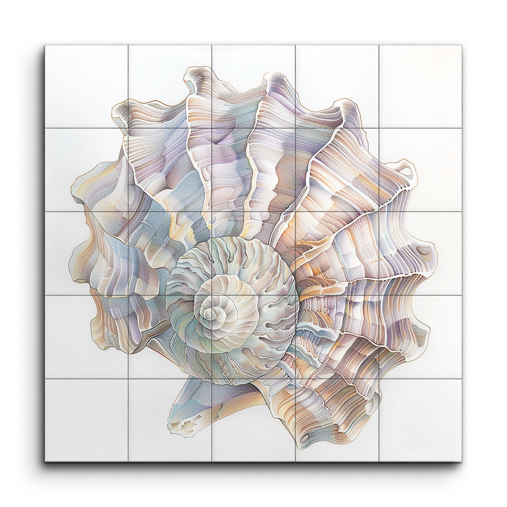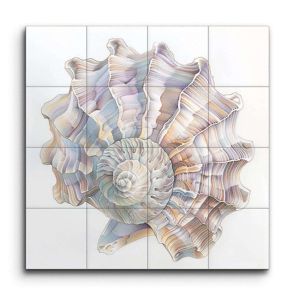 Transform your space with this stunning tile mural featuring a hyper-realistic depiction of a seashell. The intricate spiral structure and radiating ridges of the shell are meticulously rendered, capturing every fine detail and undulating wave. Soft, natural hues of cream, beige, light pink, and hints of lavender and blue blend seamlessly, creating a lifelike gradient effect. The play of light and shadow adds depth and realism, making this artwork a captivating focal point in any setting.