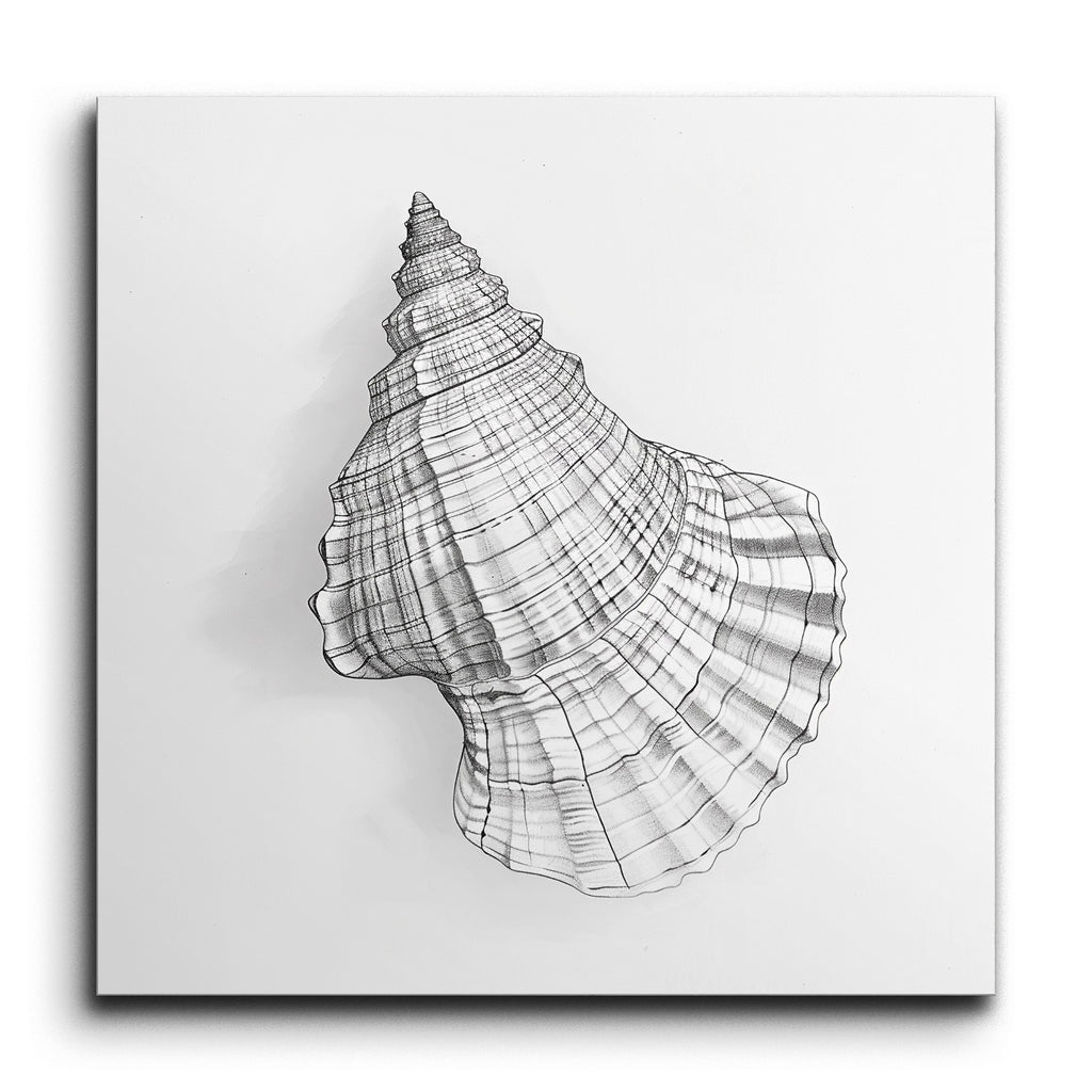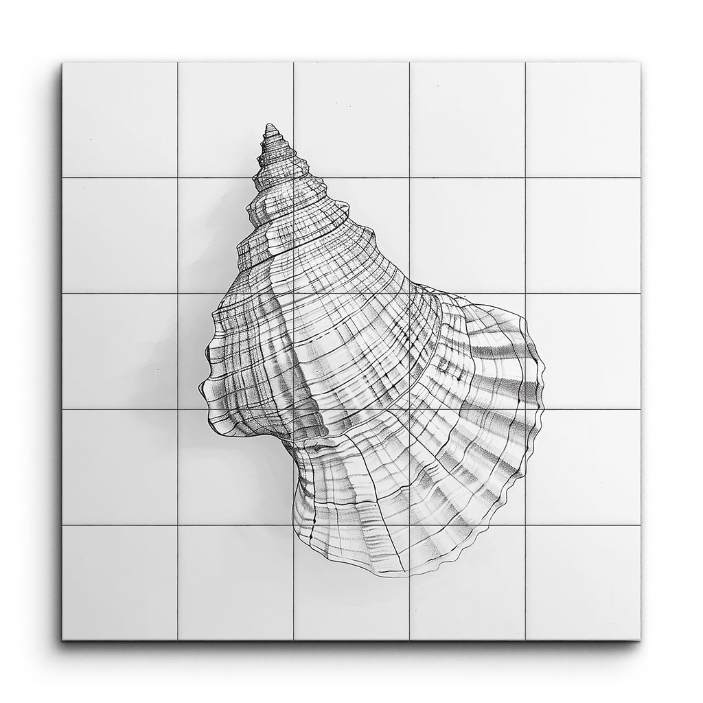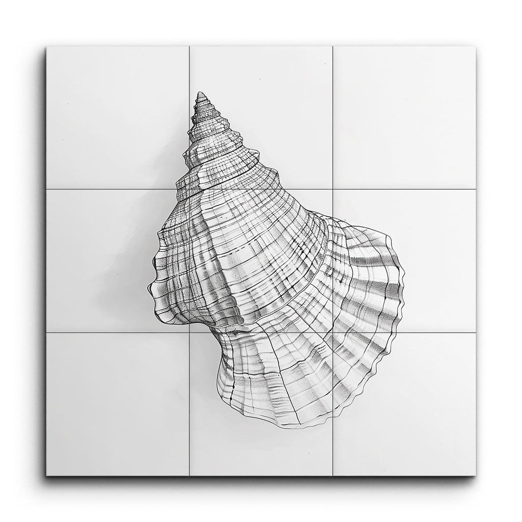 Discover the mesmerizing beauty of nature with our tile mural featuring an intricately detailed seashell illustration. This highly precise, technical artwork captures the essence of the shell's complex structure and texture through fine black lines and meticulous cross-hatching. The three-dimensional illusion highlights the shell's ridges and grooves, emphasizing both its aesthetic and structural elements. Centrally positioned, this piece invites you to appreciate the captivating natural geometry of this marine marvel.