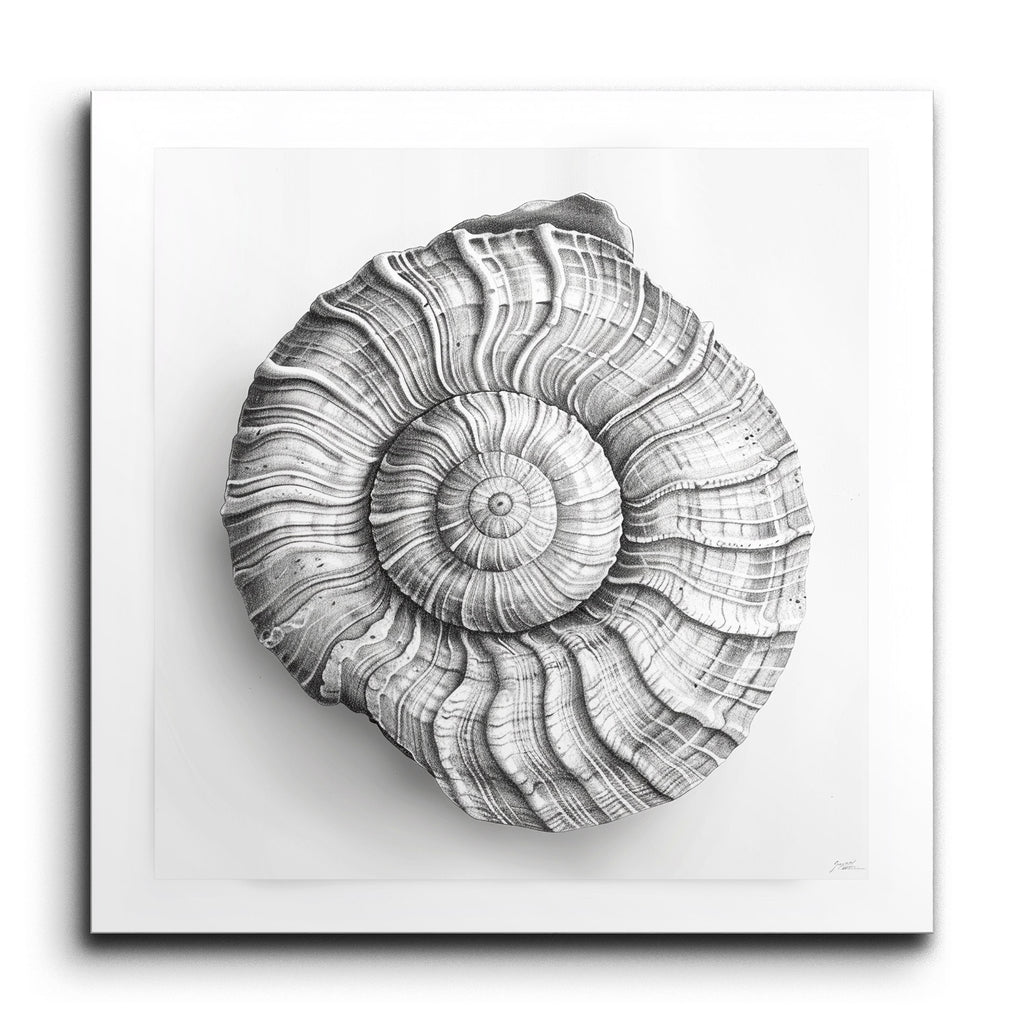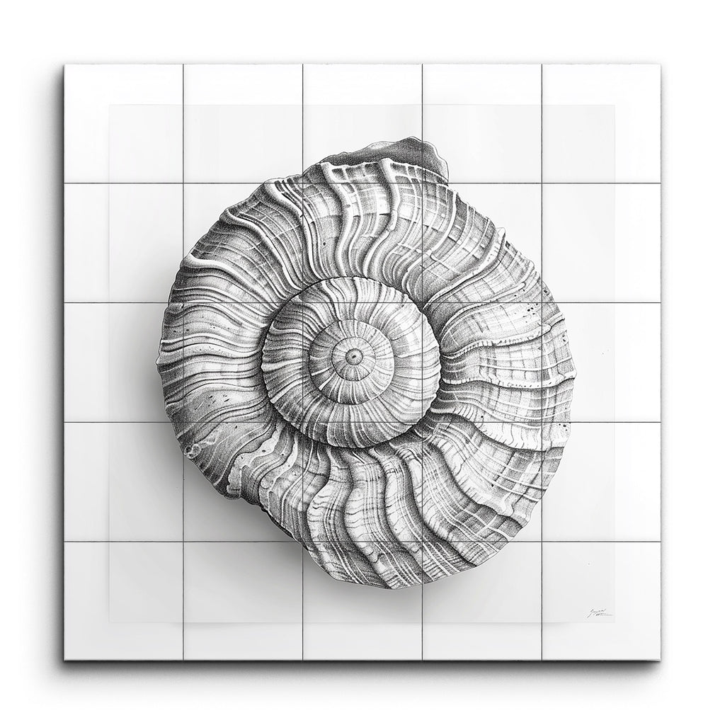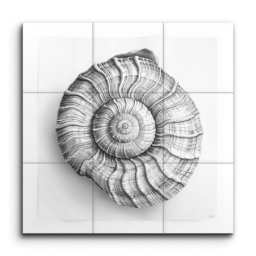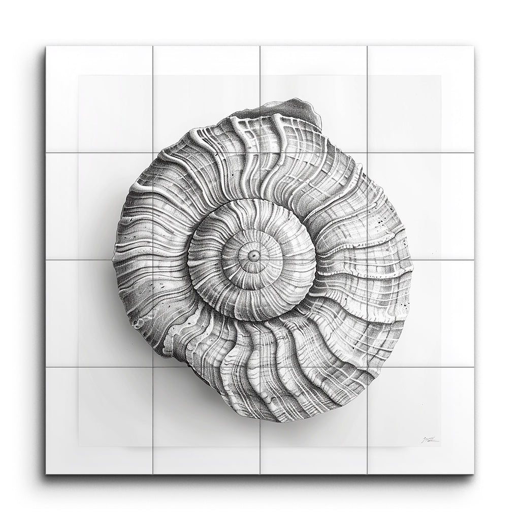 Transform your space with this stunning tile mural featuring a highly detailed, monochromatic drawing of a seashell. This artwork captures the intricate textures and patterns of the shell in a realistic style, with fine lines and shading that highlight its natural ridges and grooves. The concentric circles and layered structure are meticulously rendered, giving the shell a three-dimensional appearance. Expertly handled light and shadow create depth and volume, emphasizing the organic beauty and complexity of the seashell's form.