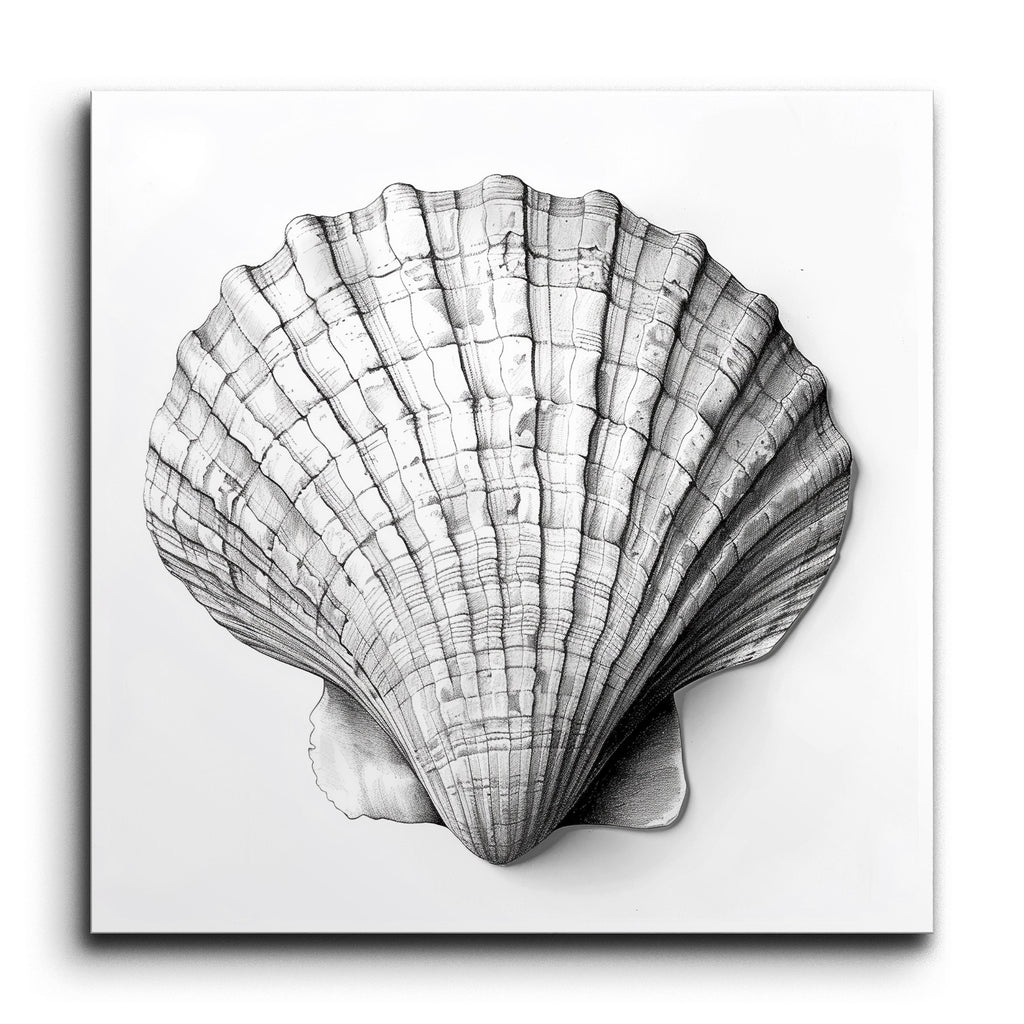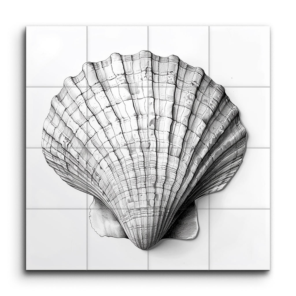 Transform your space with this exquisite tile mural featuring a meticulously detailed illustration of a seashell. Rendered in a monochromatic palette, the artwork captures the intricate textures and patterns of the shell with scientific precision. Each ridge and groove is expertly shaded to highlight the shell's natural curvature, creating a stunning three-dimensional effect. This mural is perfect for those who appreciate the beauty of nature and the artistry of detailed, realistic illustration.