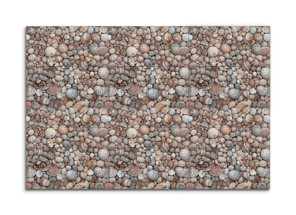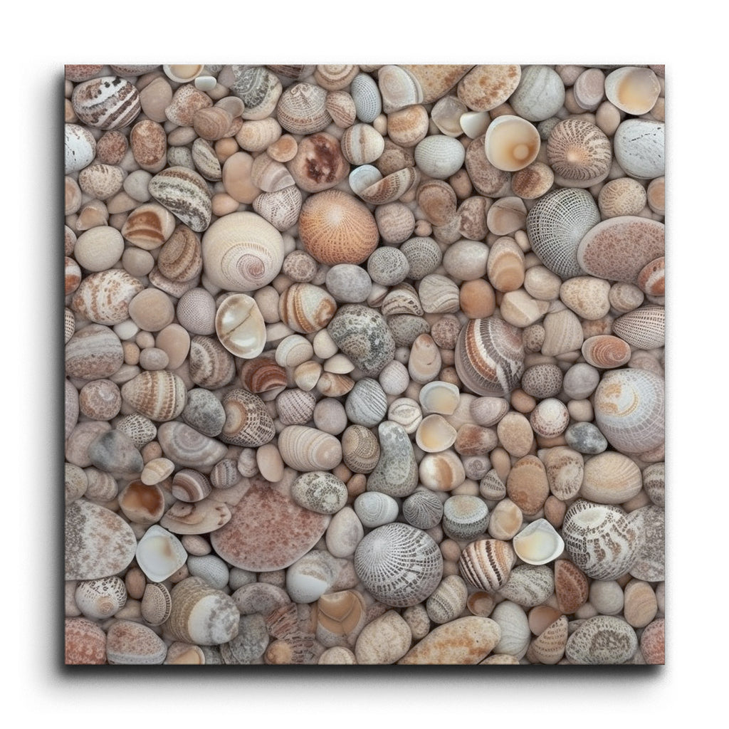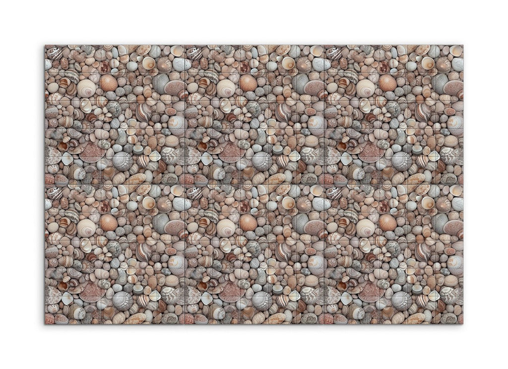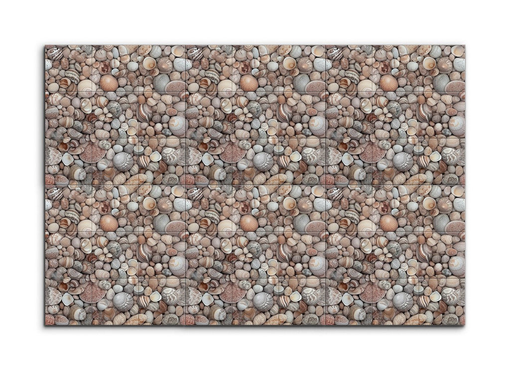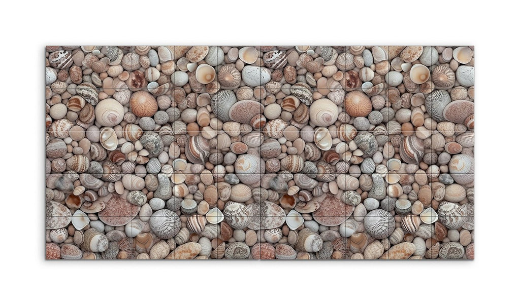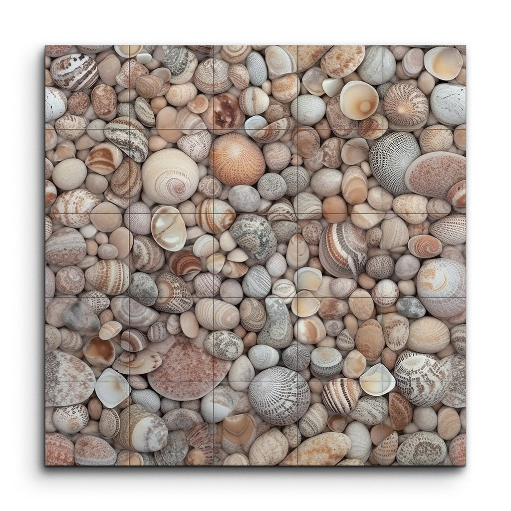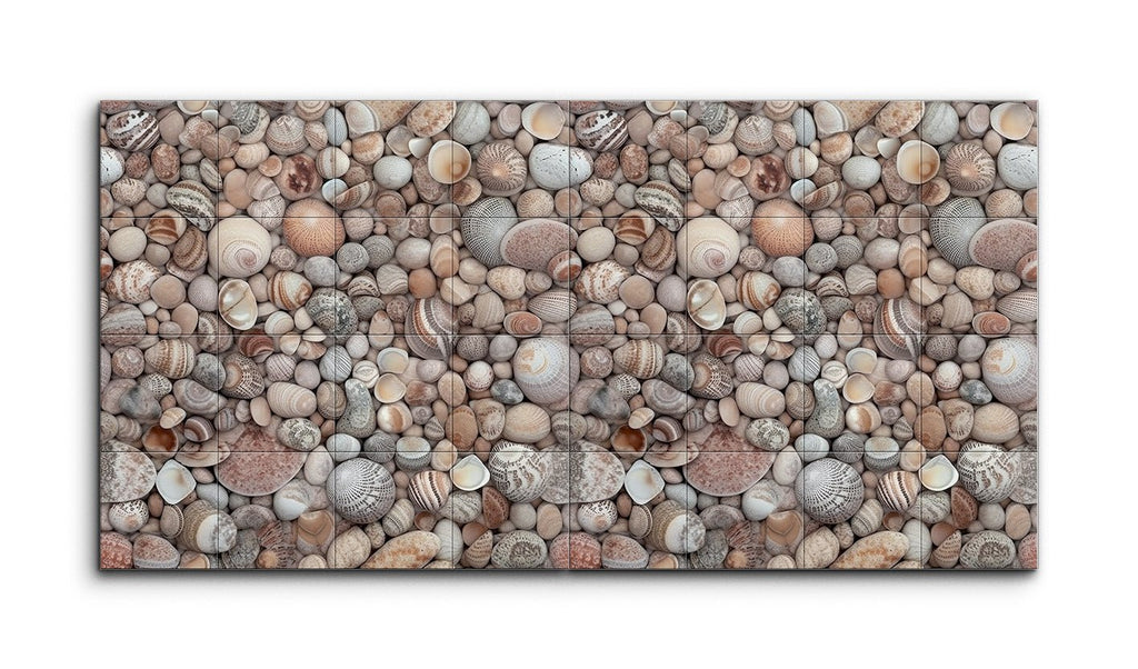 Immerse yourself in the natural beauty of the ocean with this stunning tile mural, featuring a hyper-realistic depiction of seashells and pebbles. Each element, from spiral conchs to smooth clam shells, is meticulously rendered to showcase unique textures and rich, earthy tones. The densely packed composition creates a sense of abundance and harmony, inviting close inspection and offering a tactile, lifelike portrayal of seaside treasures. This artwork captures the intricate patterns and natural imperfections, bringing a touch of coastal serenity to any space.