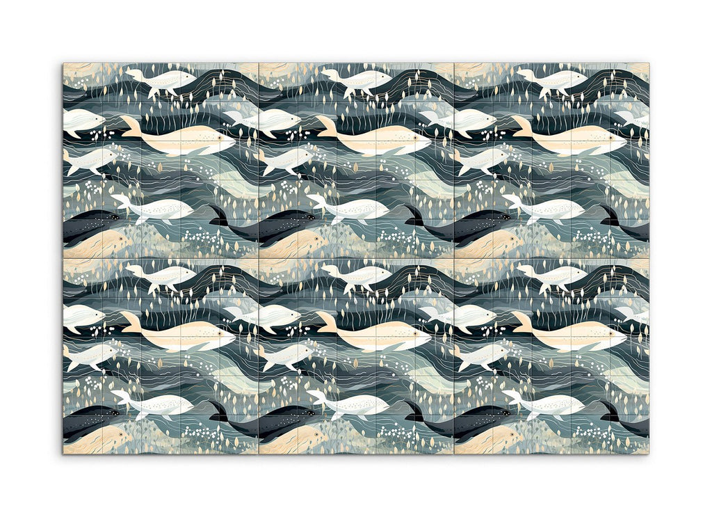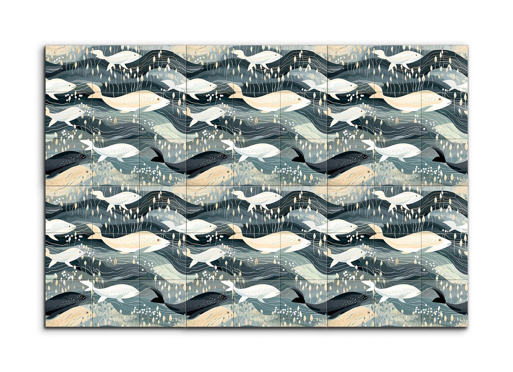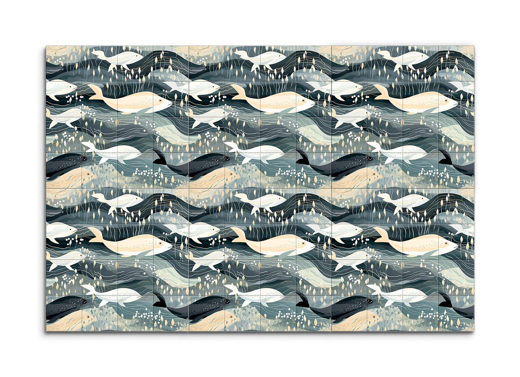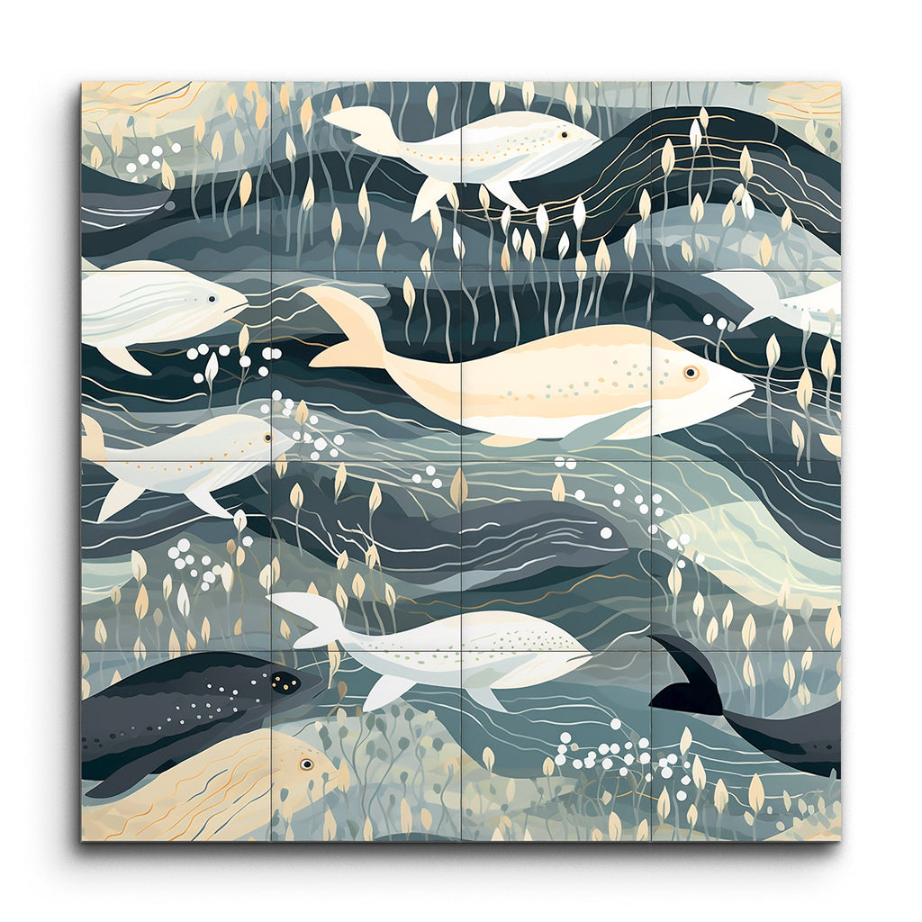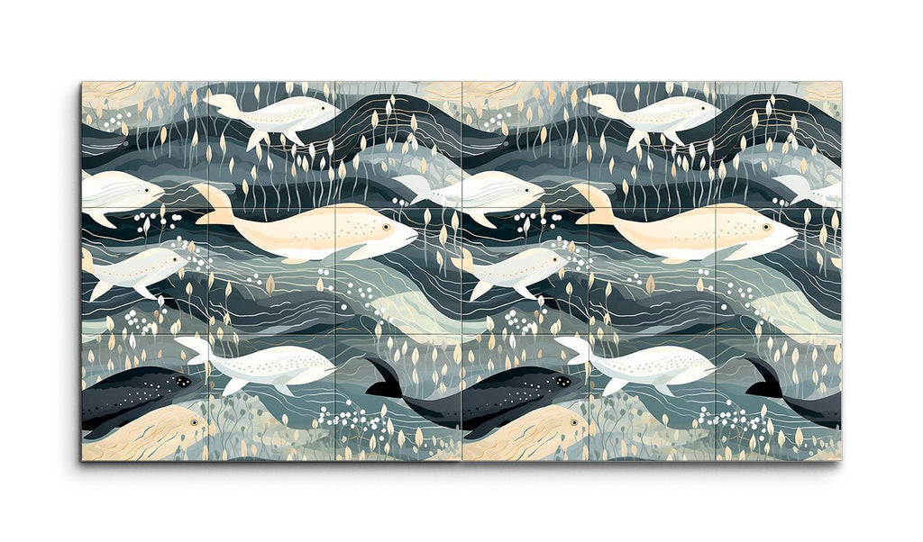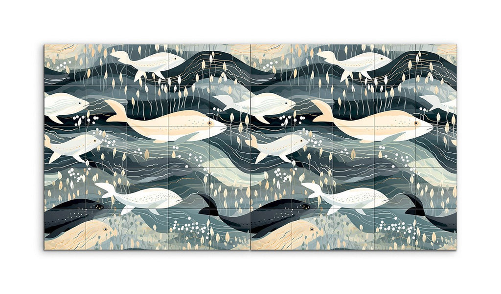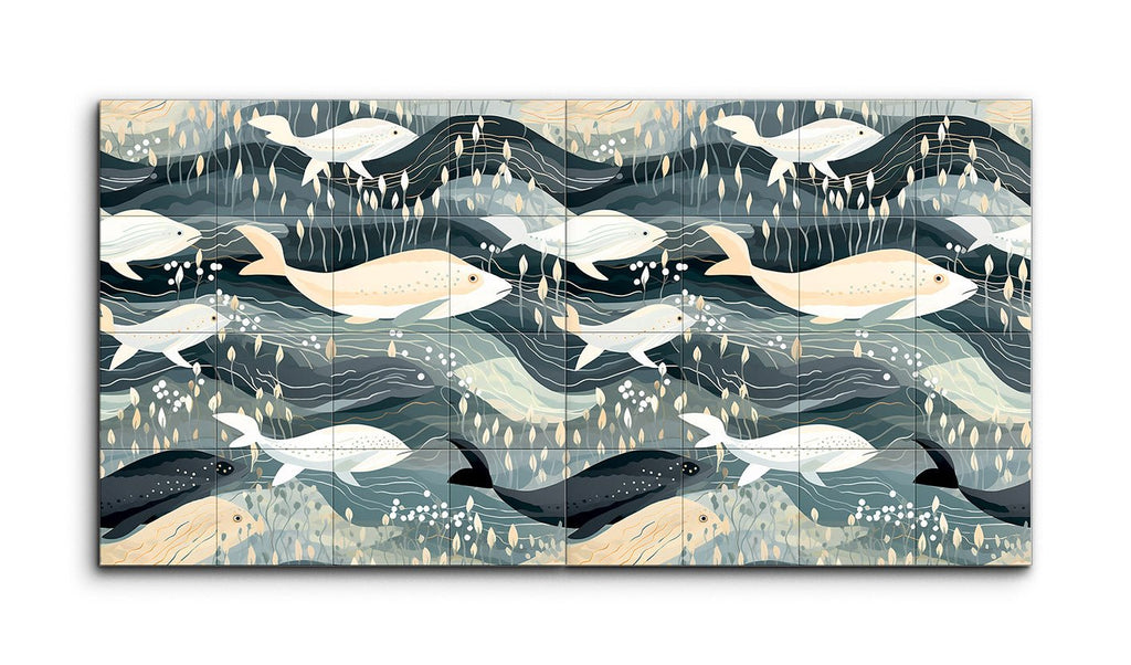 Transform your space with this exquisite tile mural, featuring a serene underwater scene where stylized fish gracefully swim amidst delicate aquatic plants. The muted tones of blue, green, and beige create a calming atmosphere, while the flowing, wavy patterns evoke the gentle movement of water. The modern, illustrative design, with its clean lines and balanced composition, invites you to immerse yourself in a tranquil, harmonious underwater world.