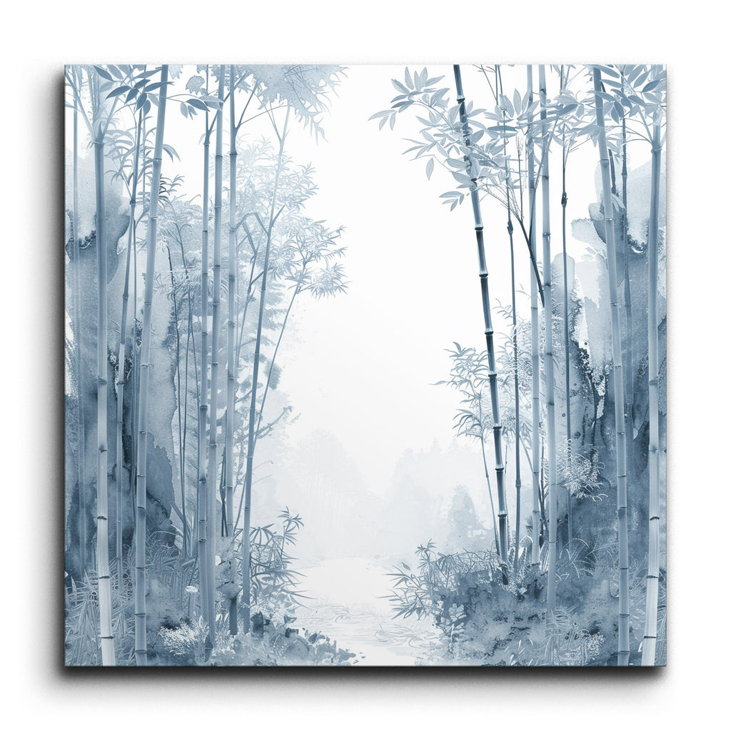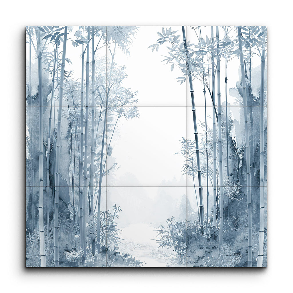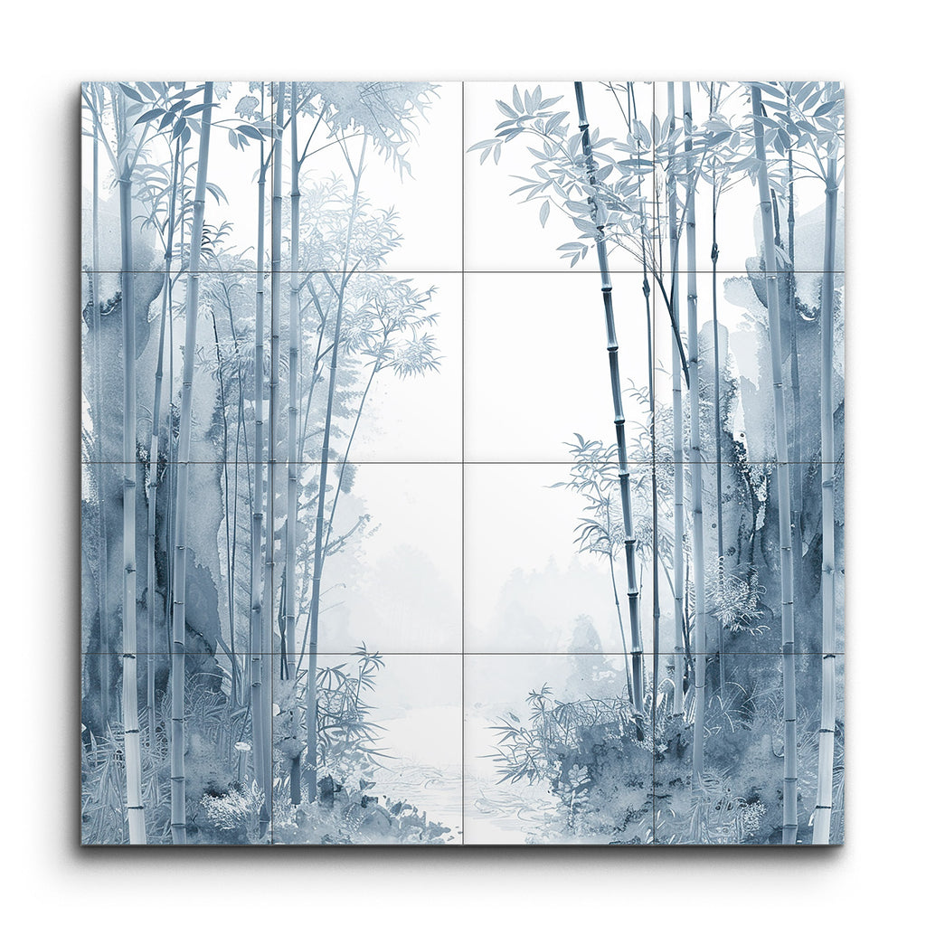 Immerse yourself in the tranquil beauty of a serene bamboo forest with this exquisite tile mural. Rendered in soft, muted blues, the artwork showcases tall, slender bamboo stalks rising vertically, exuding a sense of height and tranquility. Delicate bamboo leaves add texture and gentle movement, while a misty, ethereal background creates depth and a dreamlike quality. Reminiscent of traditional East Asian ink wash painting, this piece invites calmness and introspection, perfect for any contemplative space.