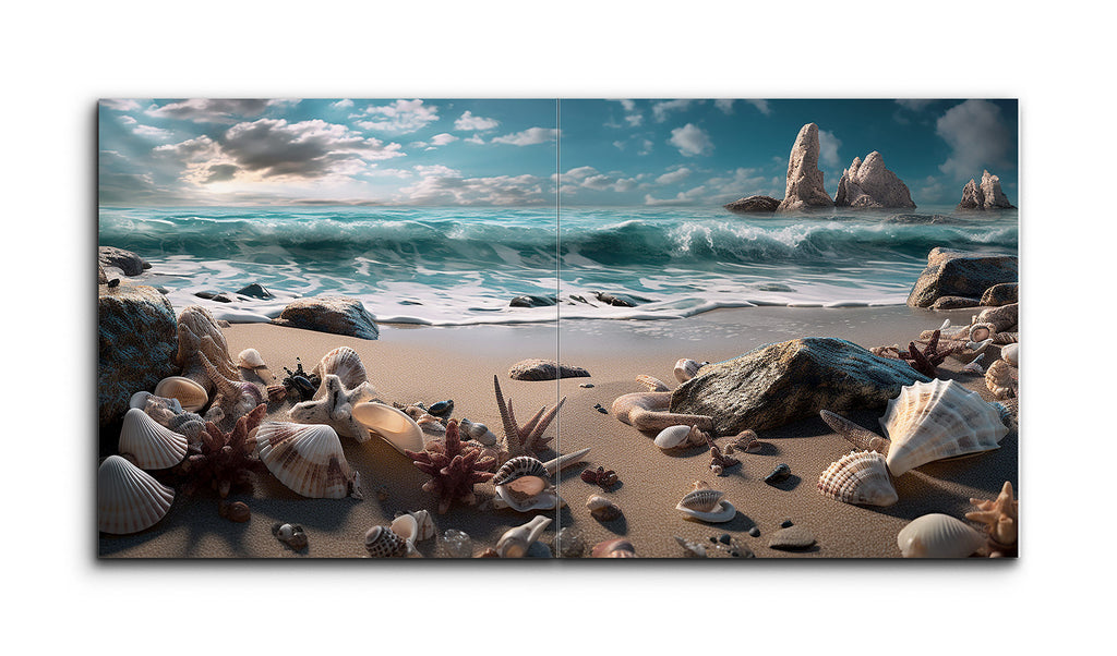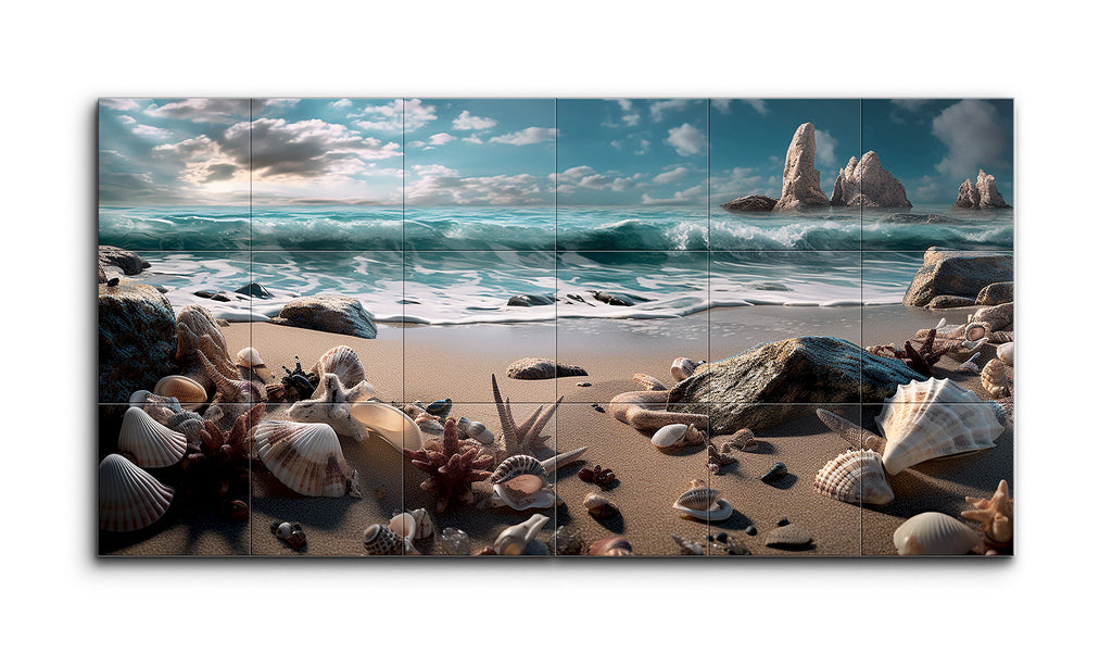 This tile mural depicts a serene beach scene with hyper-realistic details. The sandy shore is scattered with diverse seashells and starfish, varying in size, shape, and color, creating a naturalistic feel. Midground rocks add depth and texture, transitioning to a dynamic ocean with frothy, powerful waves in shades of blue and green. The dramatic sky features clouds tinged with warm sunrise or sunset hues, casting a golden light. Distant rock formations rise from the sea, adding mystery and grandeur. The meticulous realism and balanced composition invite contemplation of nature's beauty.