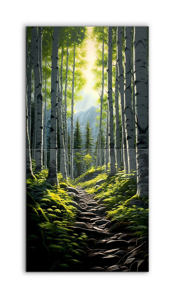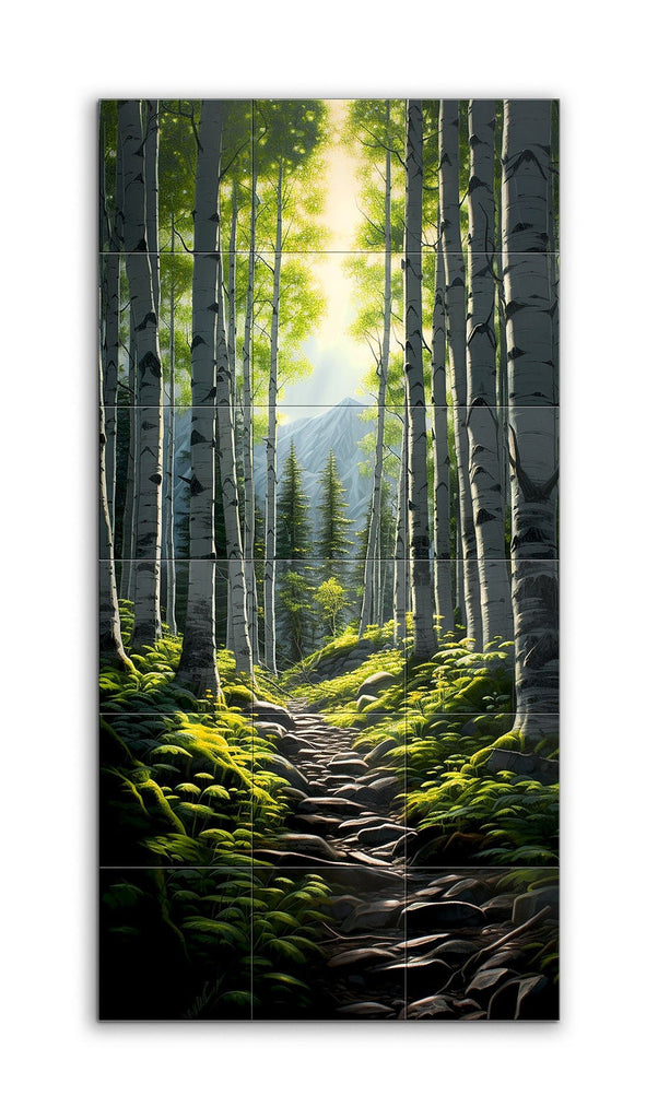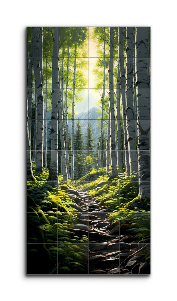 This tile mural captures a serene forest scene with a rocky path winding through a grove of tall birch trees. The distinctive white bark with black markings of the birches stretches upwards, forming a canopy of green leaves that let sunlight filter through, creating a dappled effect on the forest floor. Lush ferns and low-growing plants line the path, which leads towards a distant, softly muted mountain range. Rich greens and browns, along with detailed light and shadow play, evoke tranquility and natural beauty.
