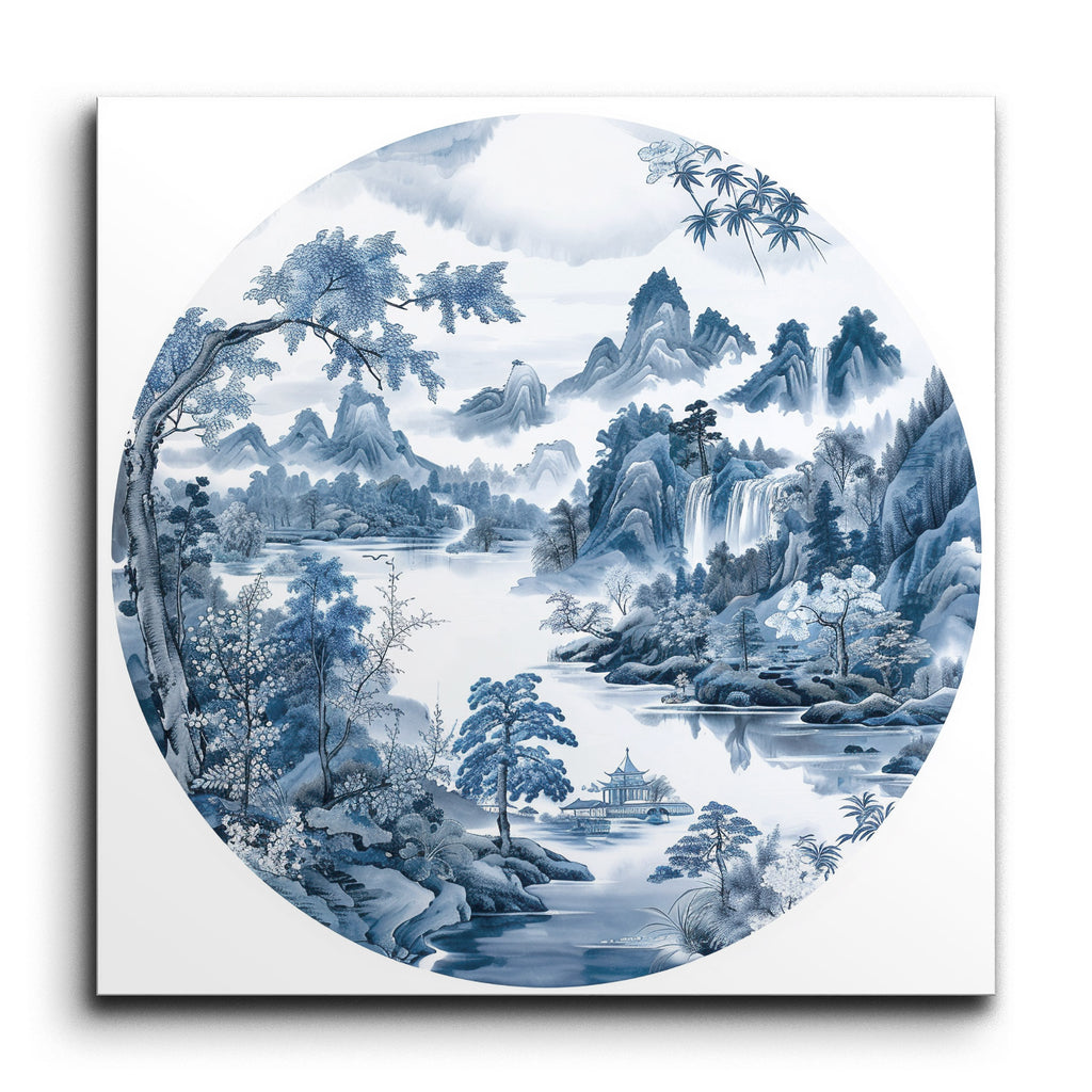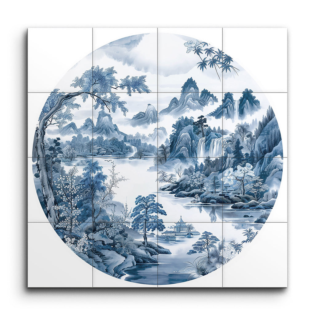 Immerse yourself in a serene and idyllic landscape with this exquisite tile mural. Rendered in a circular format, the artwork captures the harmonious blend of mountains, trees, and water in varying shades of blue and white. Intricate trees and blooming plants grace the foreground, while a tranquil river reflects the surrounding beauty. A traditional pavilion on the riverbank adds cultural charm, and majestic, mist-shrouded mountains with cascading waterfalls complete this masterpiece, evoking peace and tranquility.