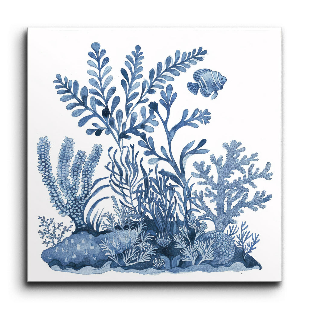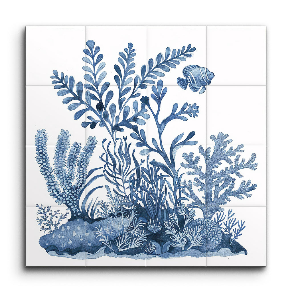 Immerse yourself in the serene beauty of an underwater world with this exquisite tile mural. The artwork features a monochromatic blue palette that captures the tranquility of marine life. Intricately detailed marine flora, from feathery fronds to branching corals, surround a lone fish swimming gracefully near the top right. The meticulous line work and botanical illustration style emphasize the natural forms and patterns, creating a calming and visually engaging composition.