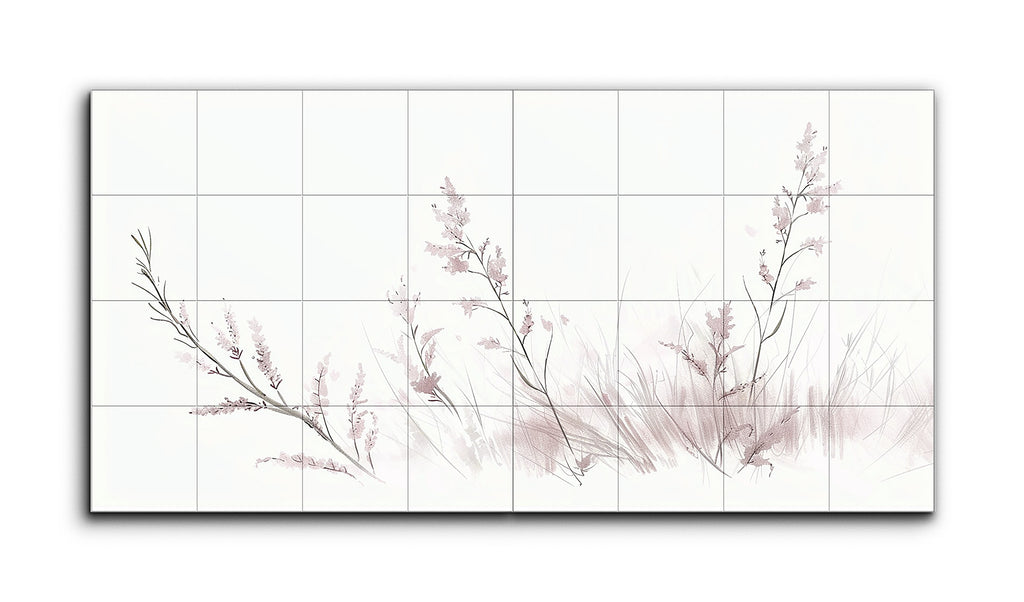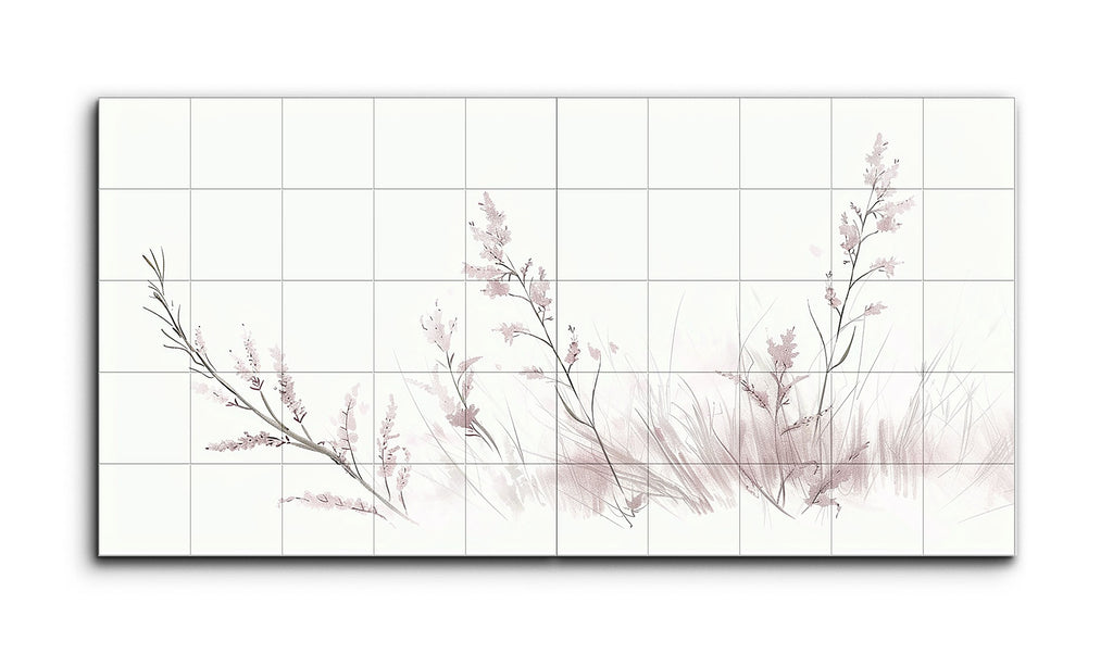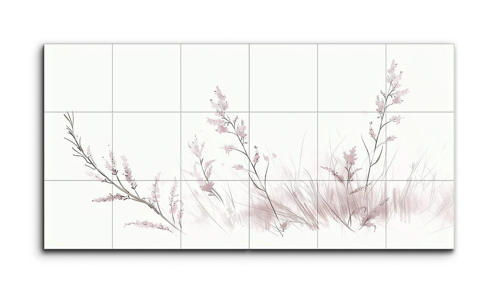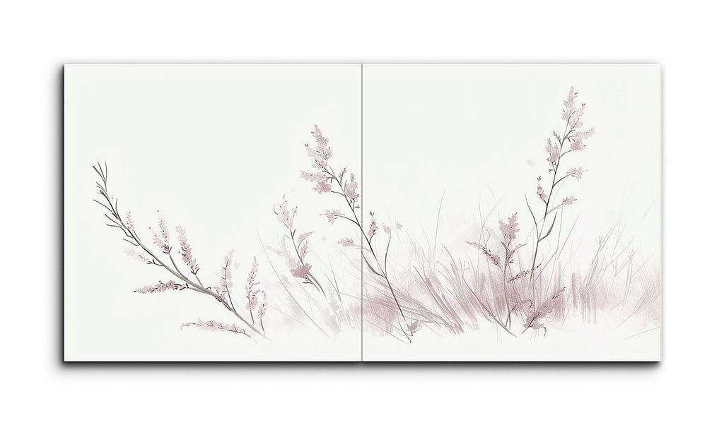This diptych tile mural embodies minimalist contemporary art, highlighting botanical elements with a serene color palette of light brown, beige, and soft pink against a stark white background. The delicate portrayal of wild grasses and slender floral stems, rendered with fine lines and subtle shading, creates an ethereal, airy composition. The division into two panels invites contemplation of their visual relationship, making this artwork a versatile addition to modern or Scandinavian interiors.